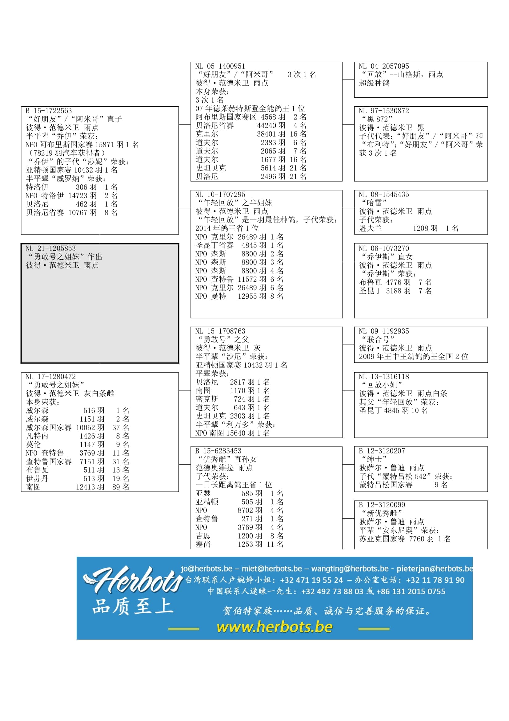 14 次入赏 – 10 次前1/10 - 6 次前1/100 - 一日长距离鸽王省1位 - 2018年鸽王全国4位 - 亚精顿国家赛8,702羽4名 - NPO 查特鲁 3,769羽4名 - 查特鲁国家赛 7,151羽12名