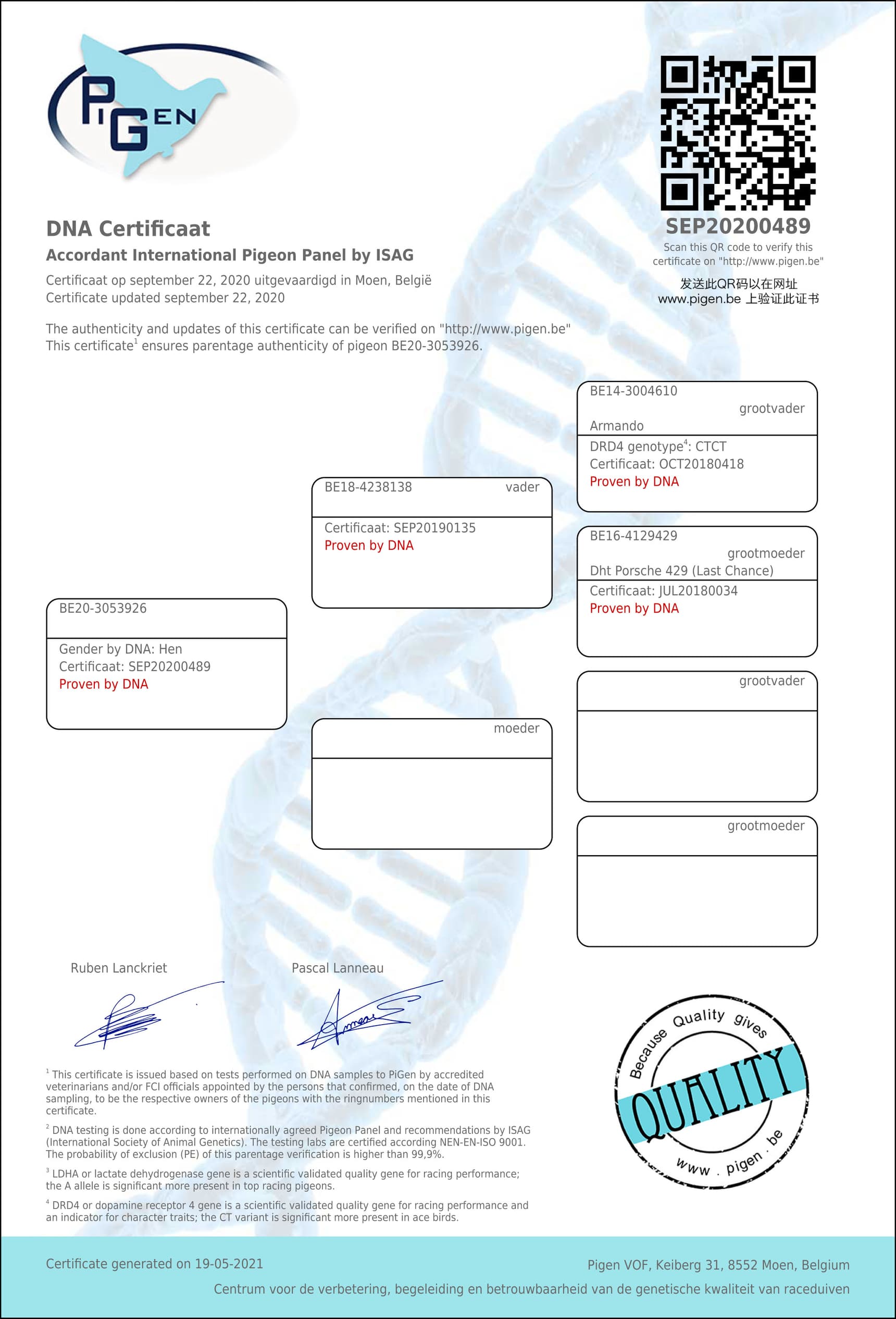 带DNA检验证书
