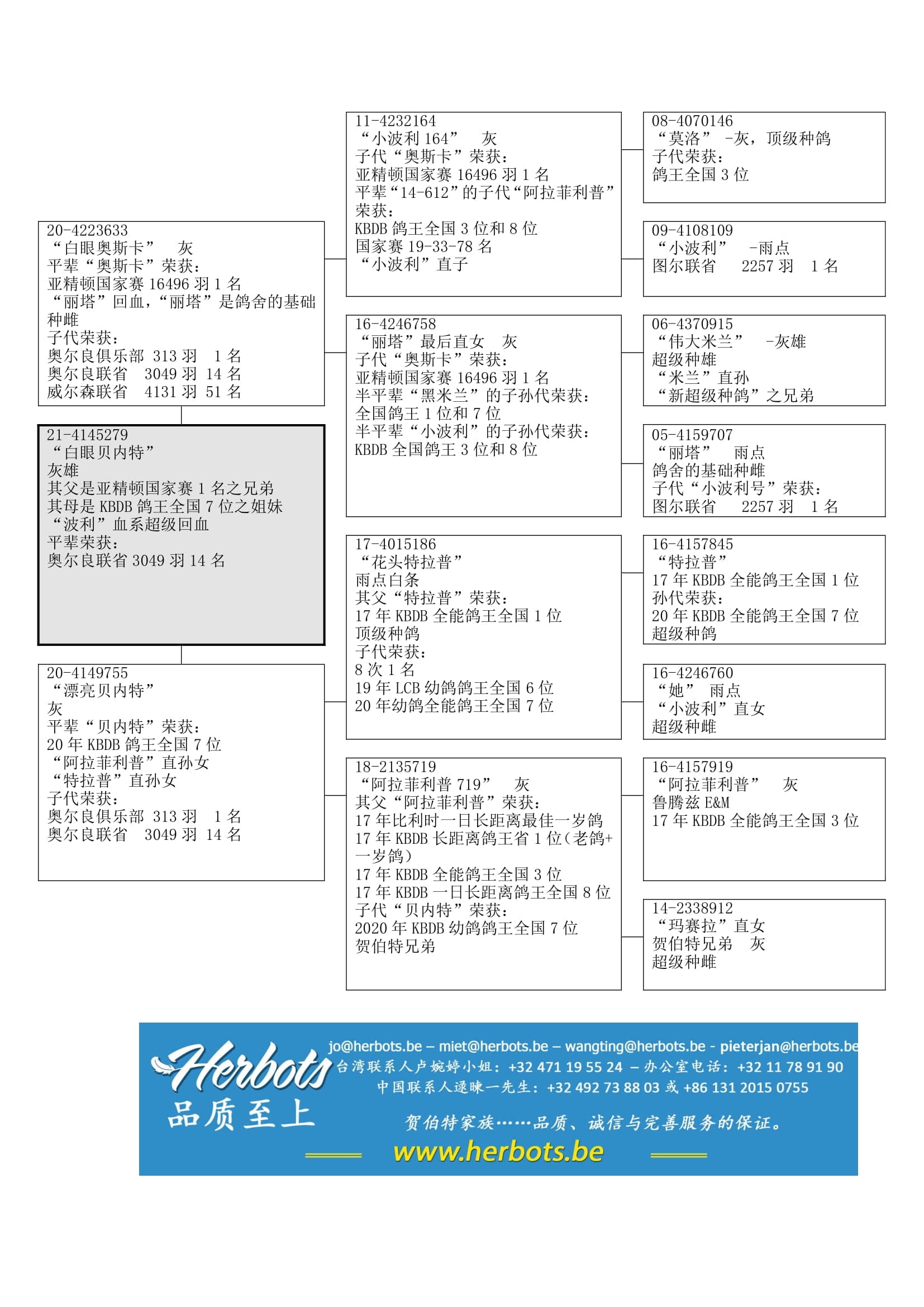 “奥斯卡”之全兄弟. “奥斯卡”荣获: 亚精顿国家赛 16,496羽1名 – 分速 19,818羽1名;“奥斯卡”的子代荣获俱乐部: 1名-2名-2名-3名-3名-3名-4名-7名-7名-8名-8名-9名-9名-10名