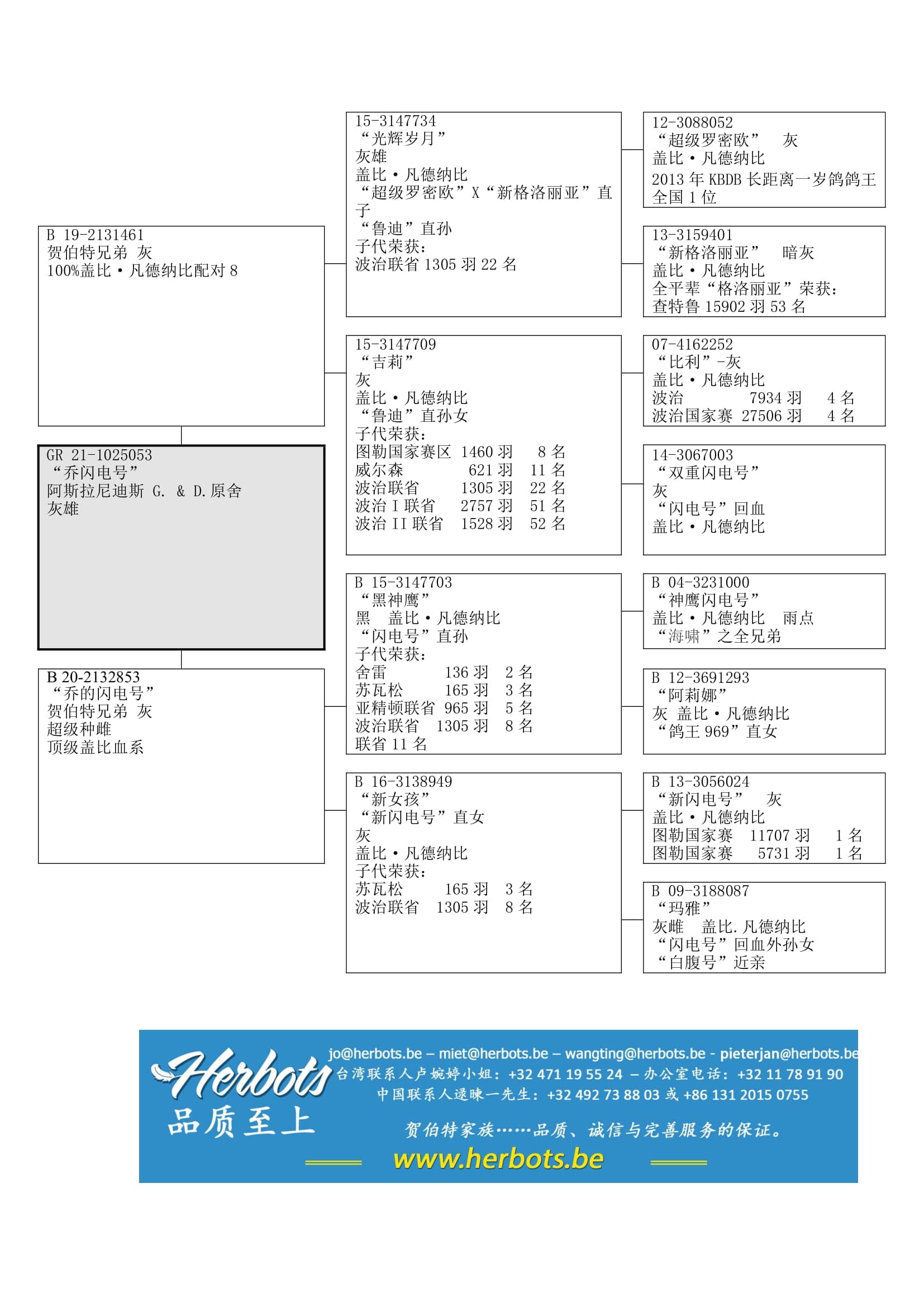子代荣获: 图勒国家赛区 1,460羽8名 – 威尔森 621羽11名 - 波治联省 2,757羽51名 – 波治联省 1,528羽52名 – 波治联省 2,481羽52名