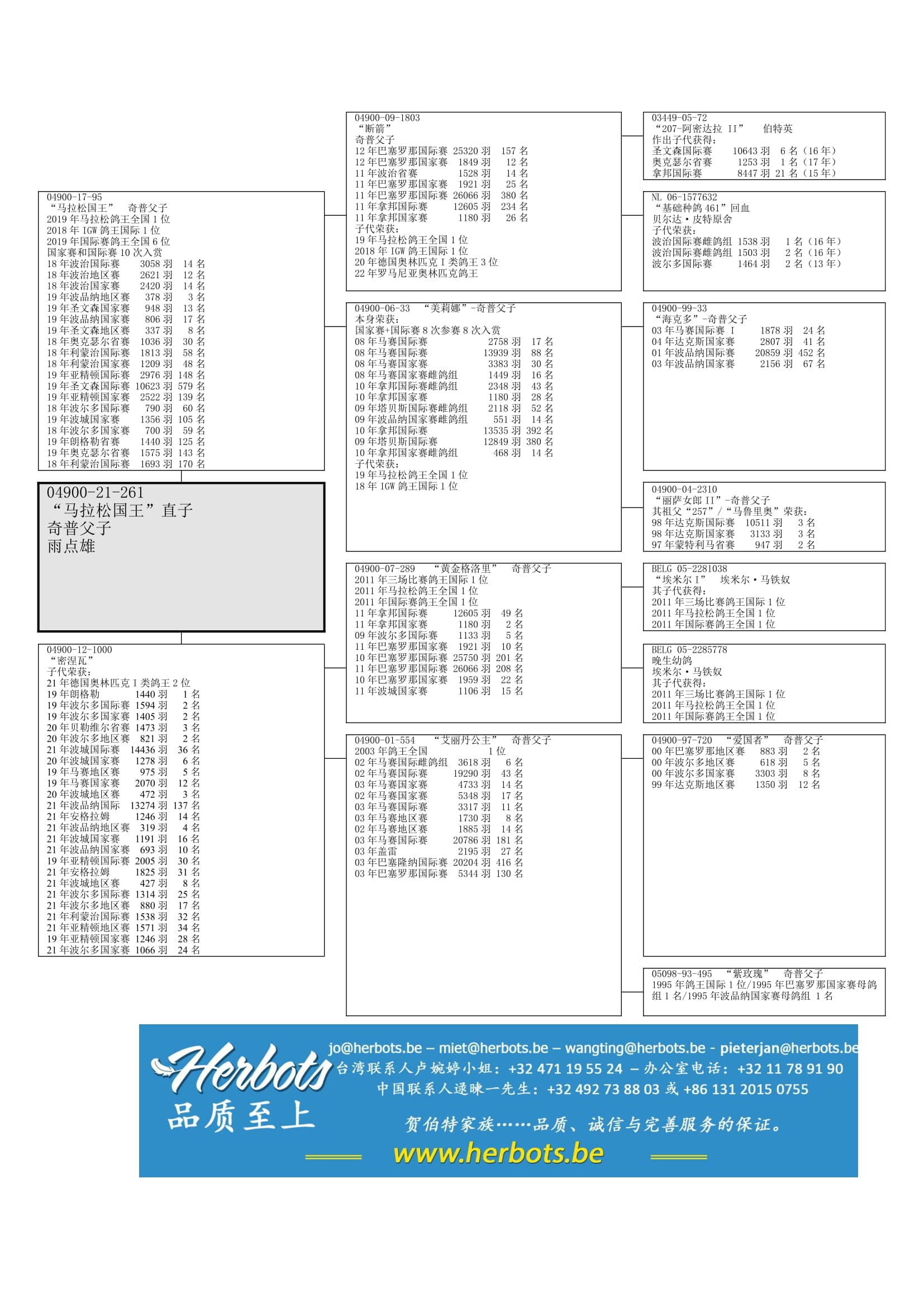 11年3场国际赛鸽王国际1位 – 波尔多国际赛 1,133羽5名 – 拿邦国际赛 12,605羽49名 - 巴塞罗那国际赛 25,750羽201名 – 巴塞罗那国际赛 26,066羽207名