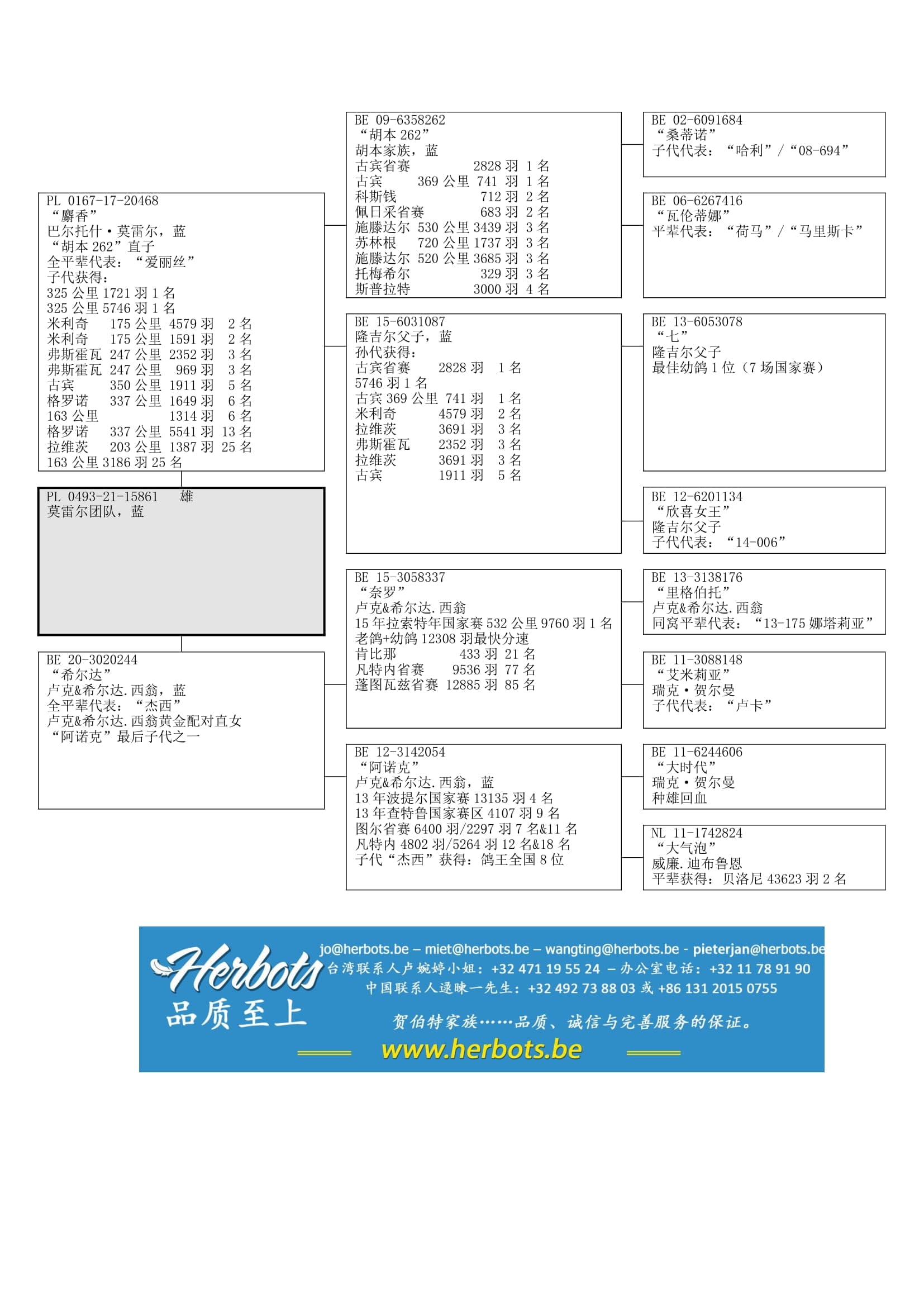 “胡本 262号” ( “桑蒂诺” x “瓦伦蒂娜”直子)x “B15-6031087” ( “Ⅶ” x “欣喜女王”直女;“Ⅶ”荣获:比利时最佳幼鸽1位-7场国家赛)作育