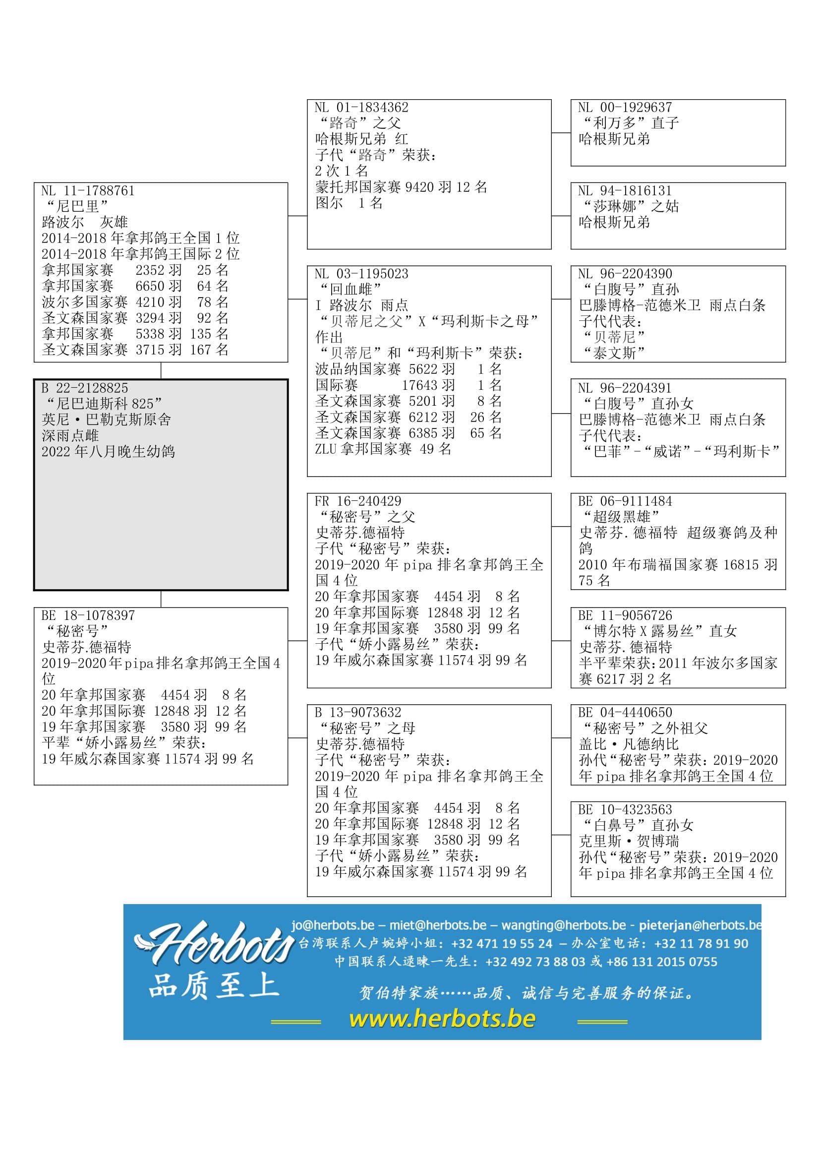 鸽系: 巴滕博格-范德米卫 (血系 “白腹号”) x 哈根斯兄弟 (血系“利万多”和“莎琳娜”)