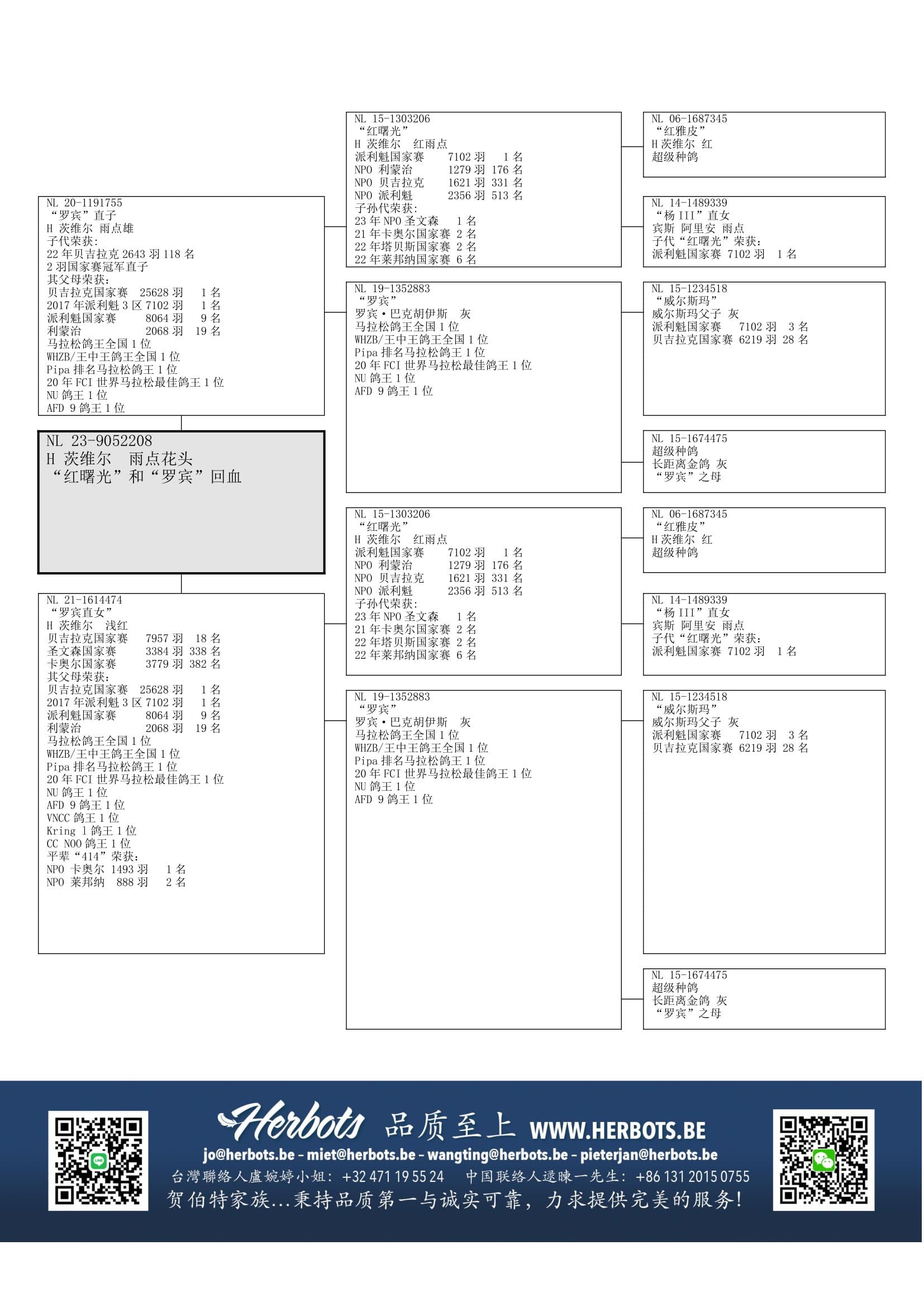 “红曙光” NL15-1303206:荣获: 派利魁国家赛 7,102羽1名孙代荣获: 23年NPO圣文森1名 21年卡奥尔国家赛2名22年塔贝斯国家赛2名 22年莱邦纳国家赛6名