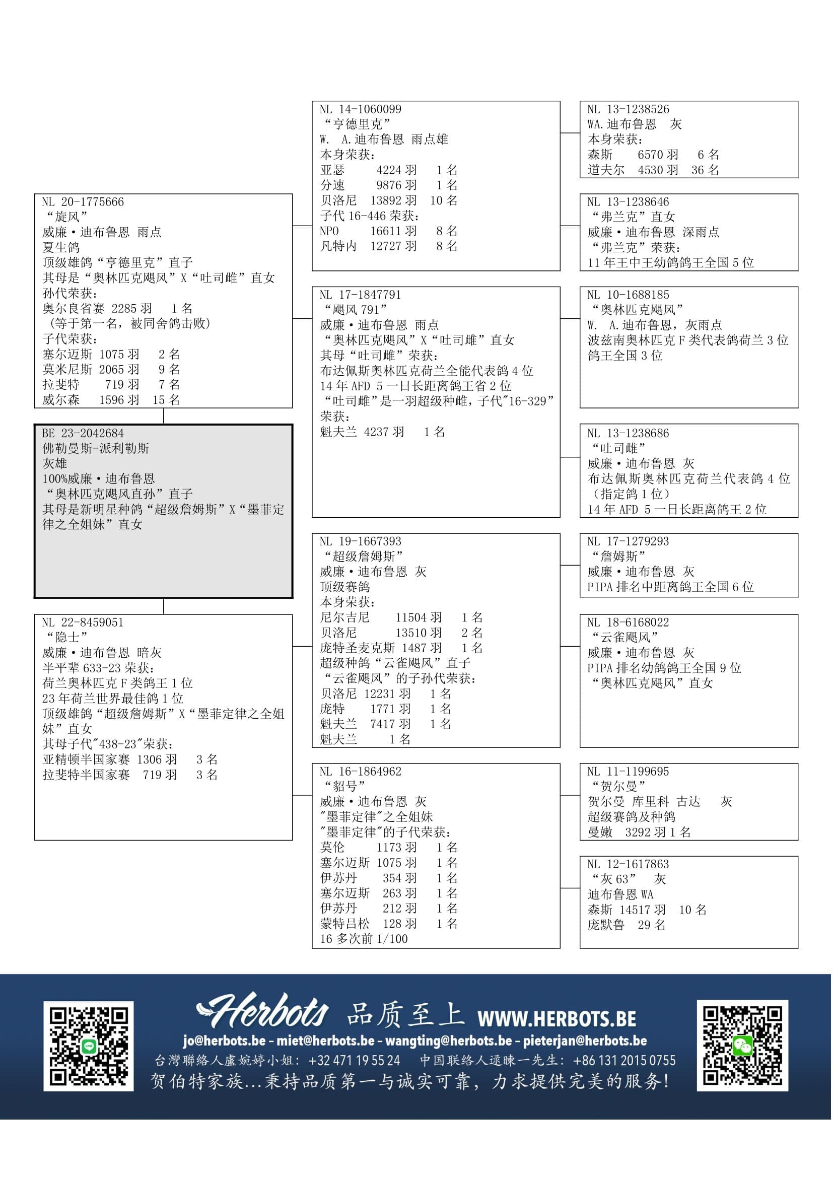 奥林匹克代表鸽以及基础种鸽“奥林匹克飓风” x “吐司雌” (奥林匹克全能鸽王4位)作出
