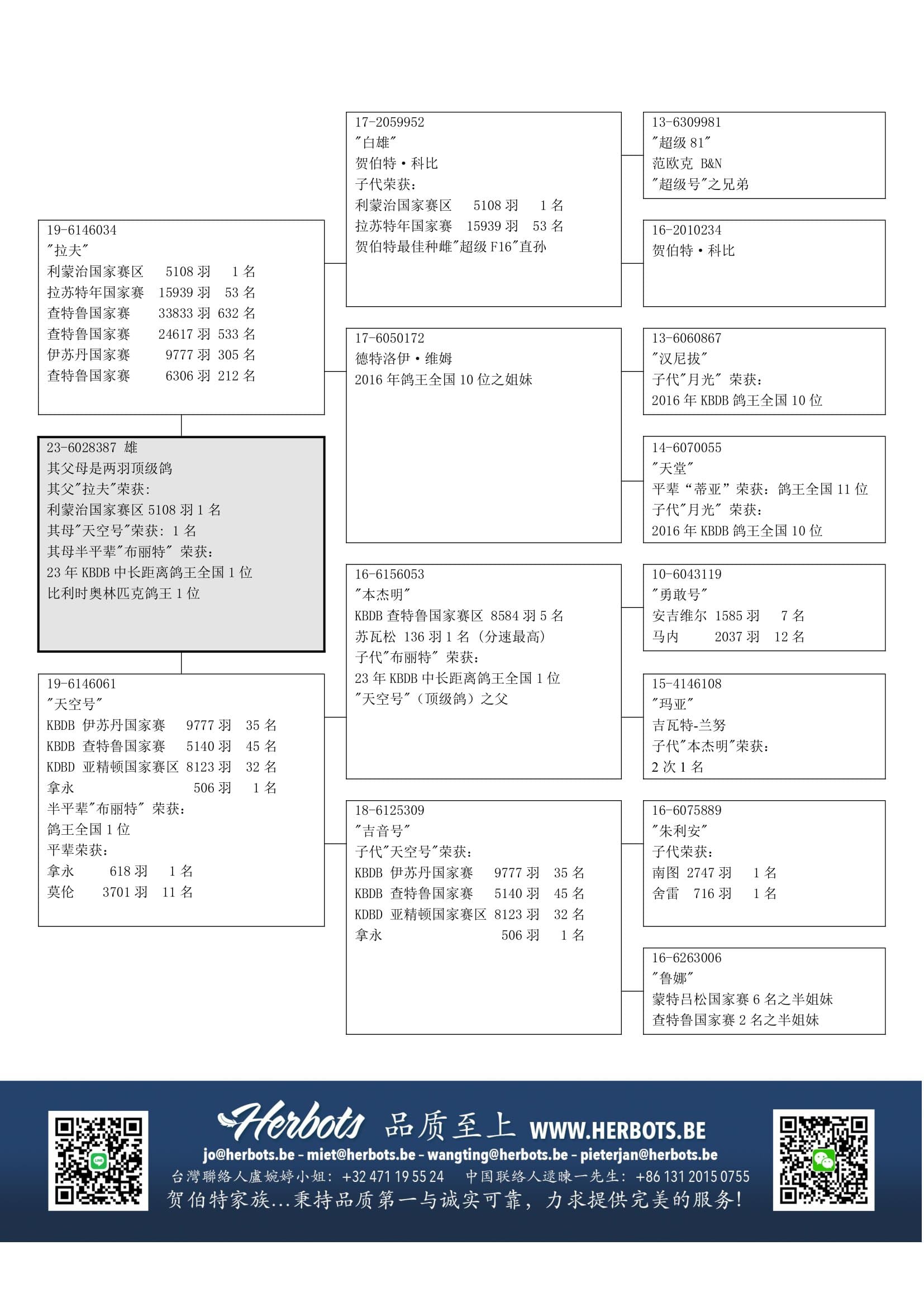 白雄” (贺伯特·科比原舍 – 血系:“葛斯顿年轻号”和“F16”-范欧克) x “B17-6050172”(全平辈荣获KBDB中长距离鸽王全国10位 –德特洛伊·维姆)作出