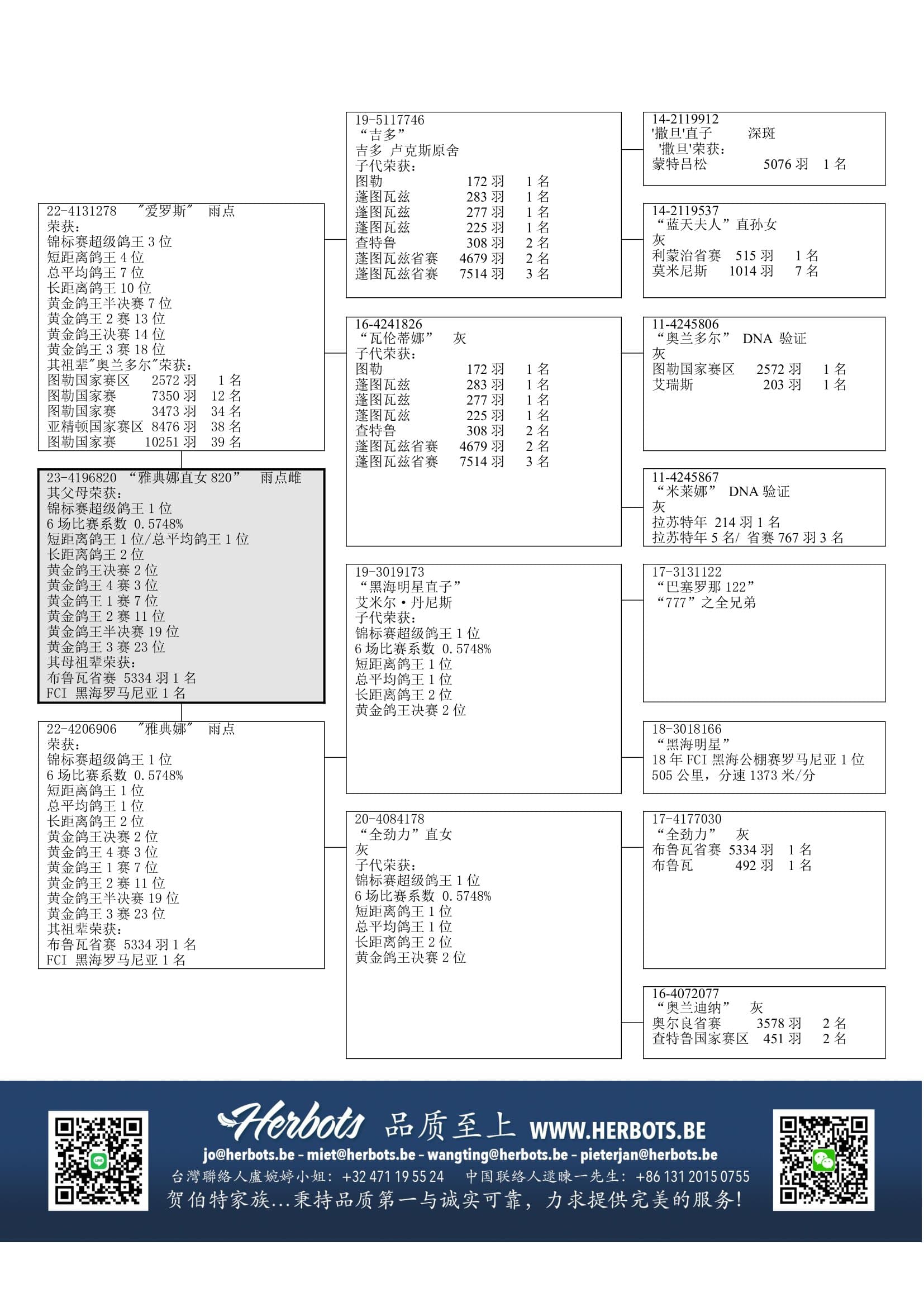 “黑海明星直子” (丹尼斯) x “全劲力直女” (出自“全劲力” (布鲁瓦省赛 5,334羽1名) x “奥兰迪纳” (奥尔良省赛 3,578羽2名 – 查特鲁国家赛区2名 - “奥兰多” x “尼克菲利亚”回血) 直女