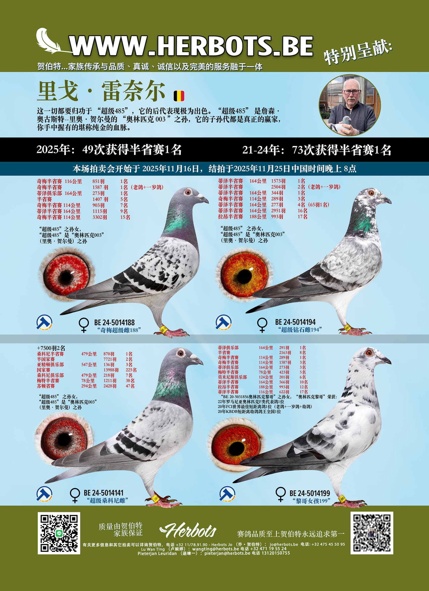 血统: “超级485” :第一最佳种鸽;6次获得1名