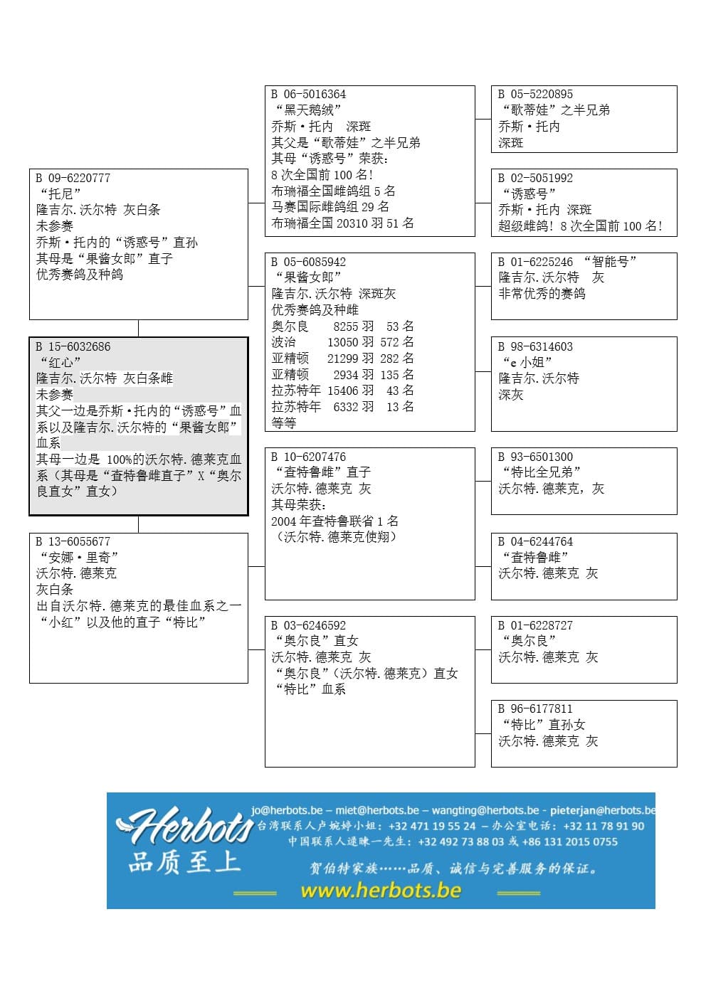 父亲: “托尼” B09-6220777“黑天鹅绒” (托内原舍 – 其父是“歌蒂娃”之半兄弟 - “诱惑号”直子, “诱惑号”荣获8次全国前100名) x 顶级雌鸽“果酱女郎”作出