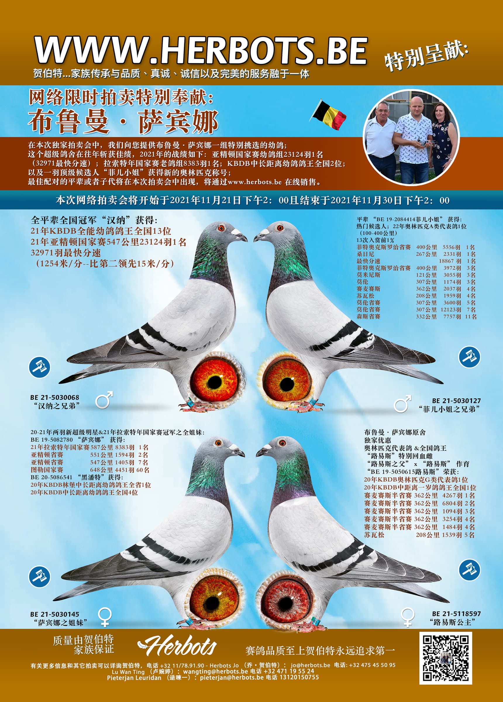 在本次独家拍卖会中,我们向您提供布鲁曼·萨宾娜一组特别挑选的幼鸽;这个超级鸽舍在往年斩获佳绩,2021年的战绩如下:亚精顿国家赛幼鸽组23124羽1名(32971最快分速);拉索特年国家赛老鸽组8383羽1名;KBDB中长距离幼鸽鸽王全国2位;以及一羽顶级候选人“菲儿小姐”获得新的奥林匹克称号;最佳配对的平辈或者子代将在本次拍卖会中出现,将通过www.herbots.be 在线销售。