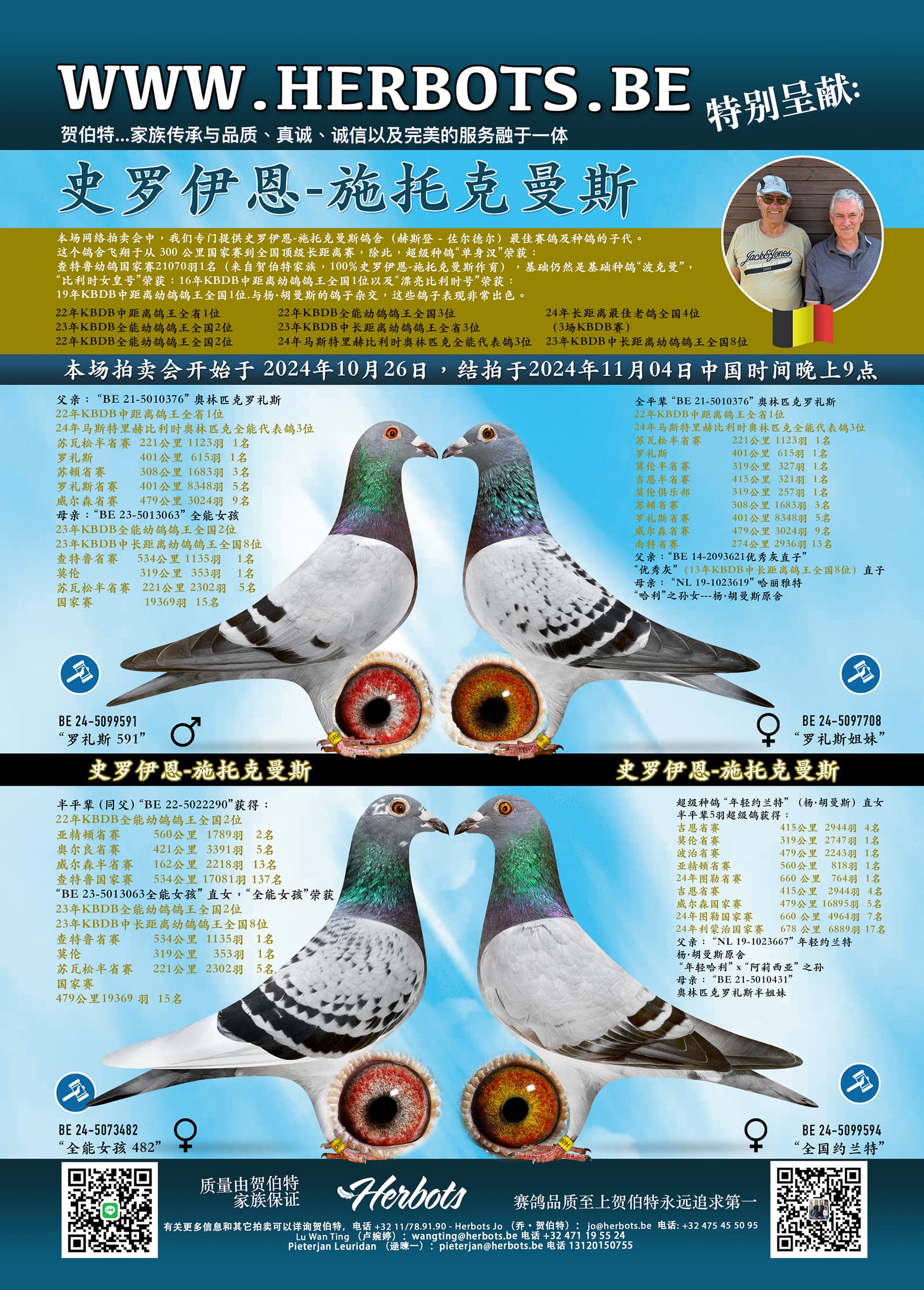 在这次网上拍卖中,我们独家提供史罗伊恩-斯托克曼斯( Schroyen - Stockmans)鸽舍最佳赛鸽和种鸽的子代。该鸽舍成绩在300 公里到长距离国家赛水平是最高的。而贺伯特家族使翔和作出的“单身汉”(查特鲁全国 21,070 羽幼鸽组冠军)也是100%史罗伊恩-斯托克曼斯血统。