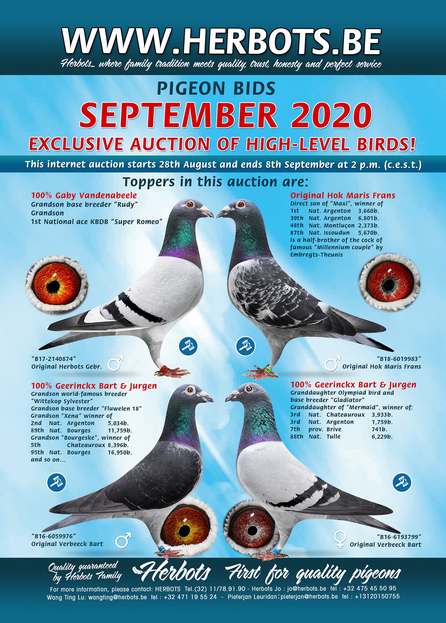 HERBOTS IMEX 贺伯特“麦克西”之半兄弟, “麦克西”荣获: 亚精顿国家赛 3,660羽1名 - 亚精顿国家赛 6,801羽39名 – 蒙特吕松国家赛 2,373羽48名 - 伊苏丹国家赛 5,670羽87名