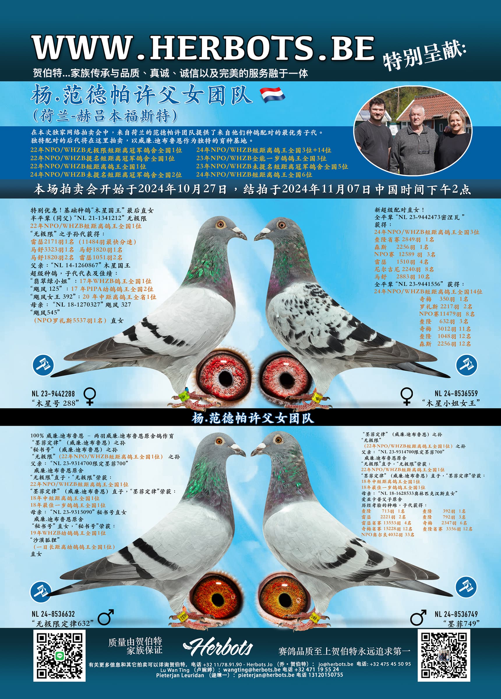 在这场独家綫上拍卖会上,来自荷兰的范德帕斯团队提供了他们种鸽配对中最優秀的鸽子。在这奉献给大家独特配对的子代以威廉·迪布恩最佳血统为基础。
