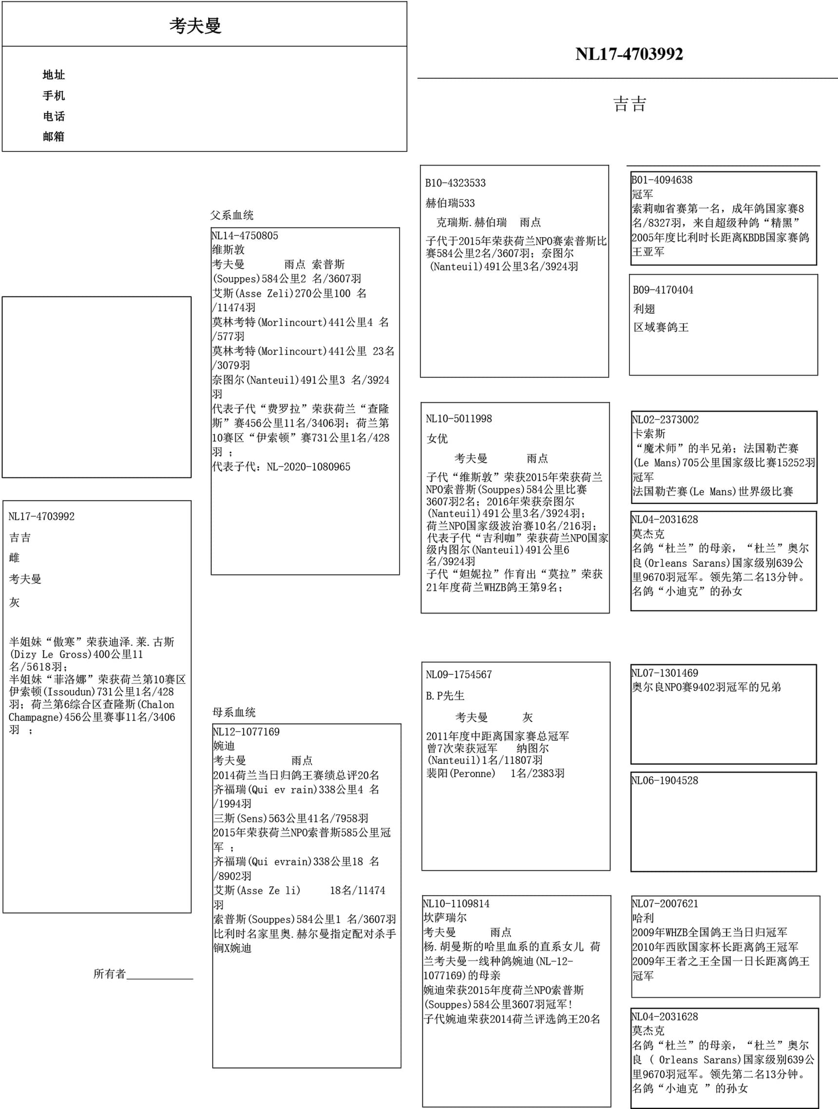 出自 “B.P先生” (1名全国. 鸽王 NPO 中距离2011 – 1名奈图尔11,807羽, 1名佩罗纳 2,383羽) x “坎萨瑞尔” (出自 “哈利 ” –杨.胡曼斯原舍)