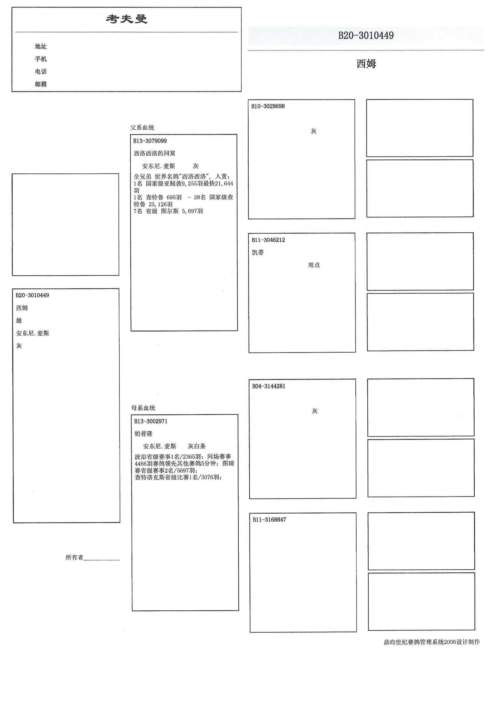 父亲:“西洛西洛同窝”B13-3079099全兄弟 世界名鸽“西洛西洛”, 入赏:1名 国家级亚精敦9,255羽最快21,644羽1名 查特鲁 695羽 28名 国家级查特鲁 25,126羽7名 省级 图尔斯 5,697羽