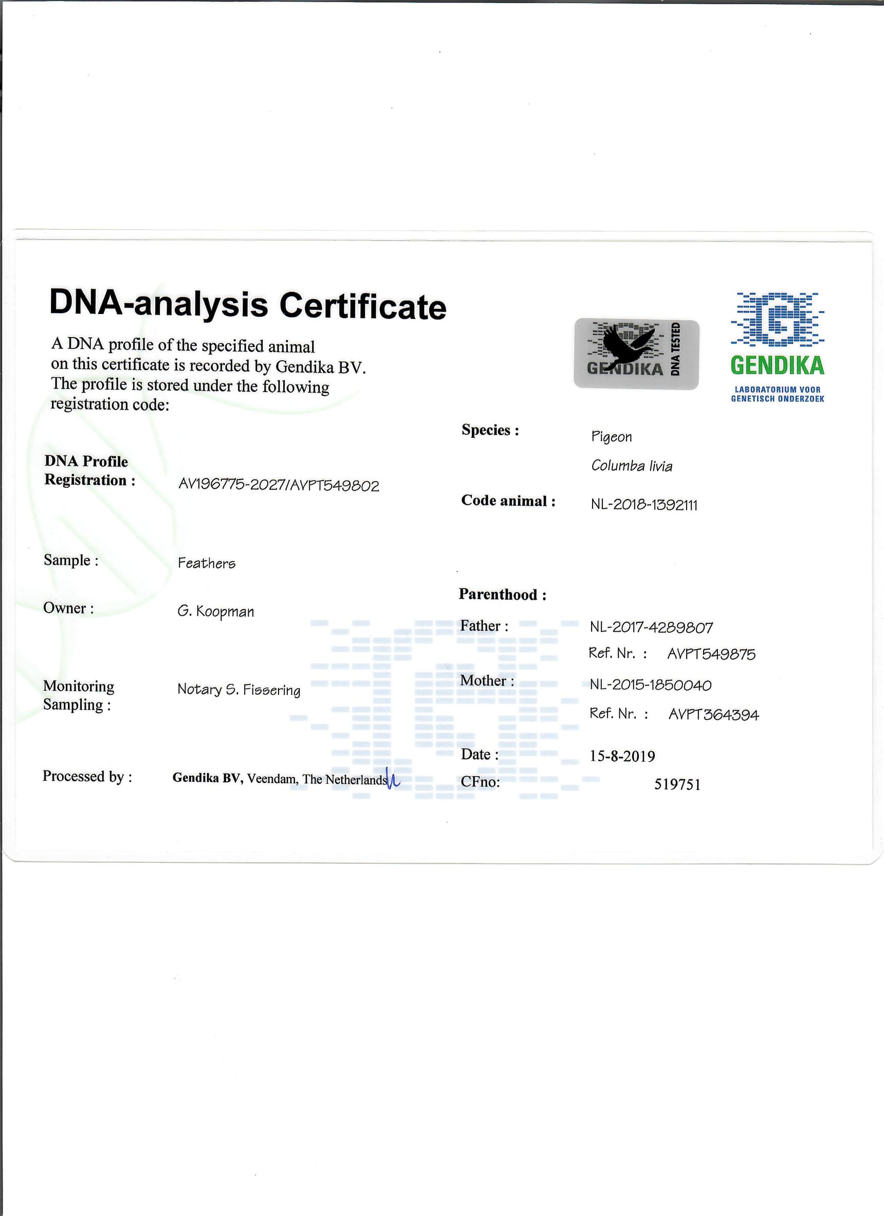 出自配对“蓝色希望” x “震撼蓝” (4名, 8名和 10名 国家赛鸽王入赏WHZB)