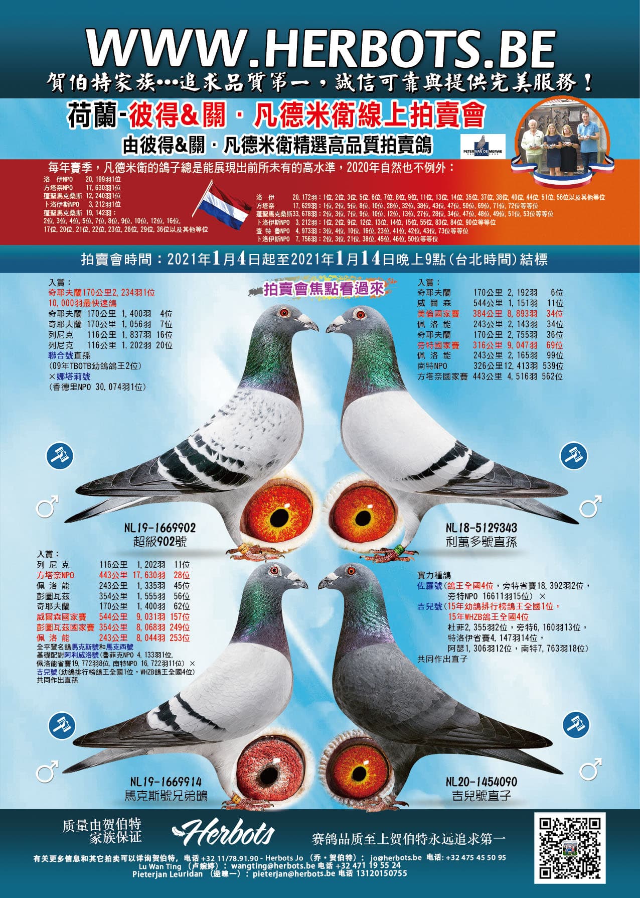 HERBOTS IMEX 贺伯特半平辈荣获:魁夫兰 1,208羽1名 – 魁夫兰 3,752羽4名 – NPO 南图 16,722羽4名 - NPO 布鲁瓦 13,155羽5名 – 贝洛尼省赛 20,239羽6名 – NPO鲁飞 3,770羽6名 - NPO 森斯 6,019羽8名 – 尼维尔 4,300羽10名和12名 – 贝洛尼13,438羽18名 -