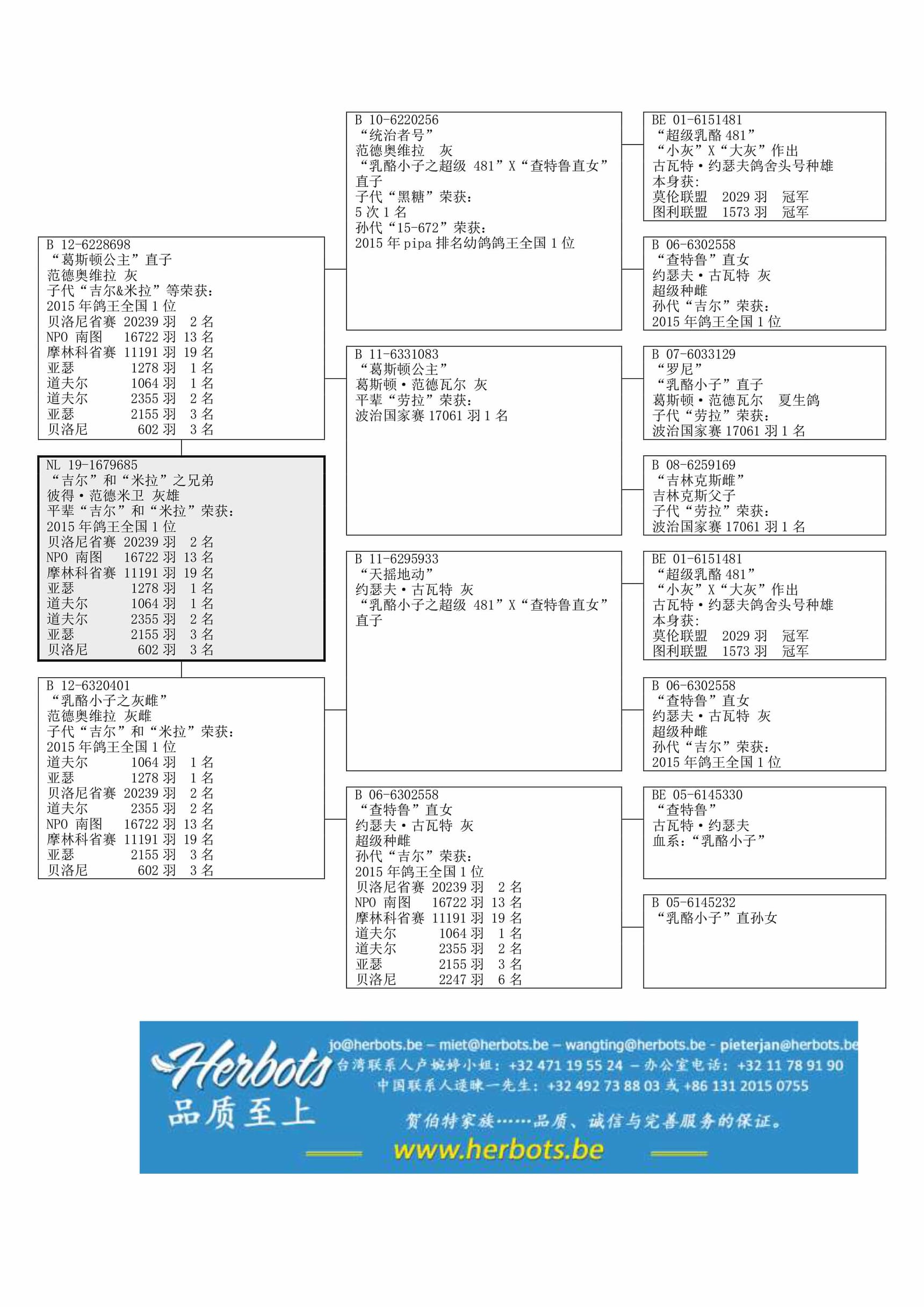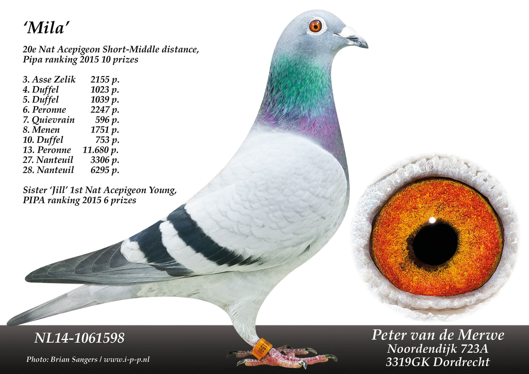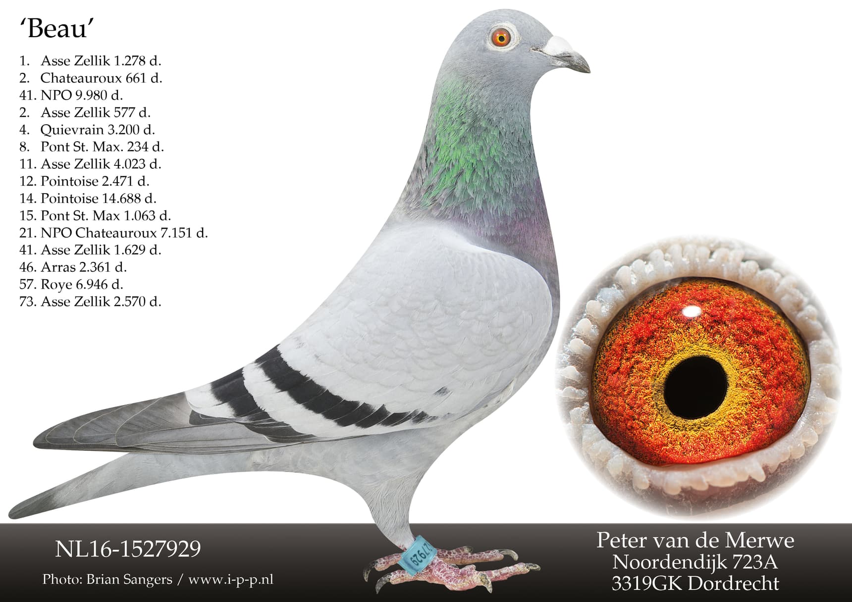 100% 盖伊·范德奥维拉“吉尔”之全兄弟. “吉尔” 荣获 :15年幼鸽鸽王全国1位 (排名) – 15年WHZB鸽王全国4位 – 道夫尔 2,355羽2名 – 庞特 6,160羽13名 – 亚瑟 1,306羽12名 - 特洛伊省赛 4,147羽14名 – 南图 7,763羽18名