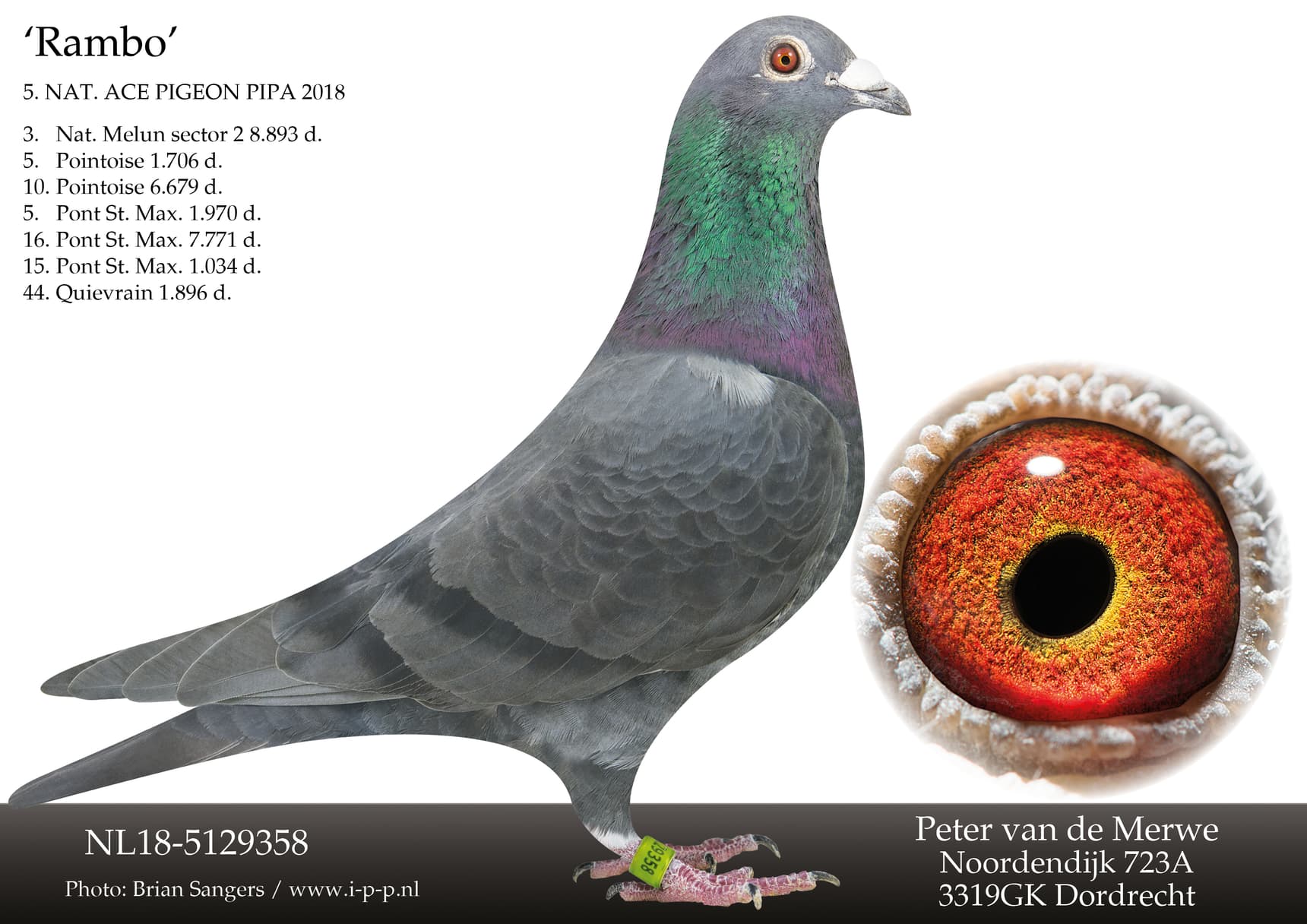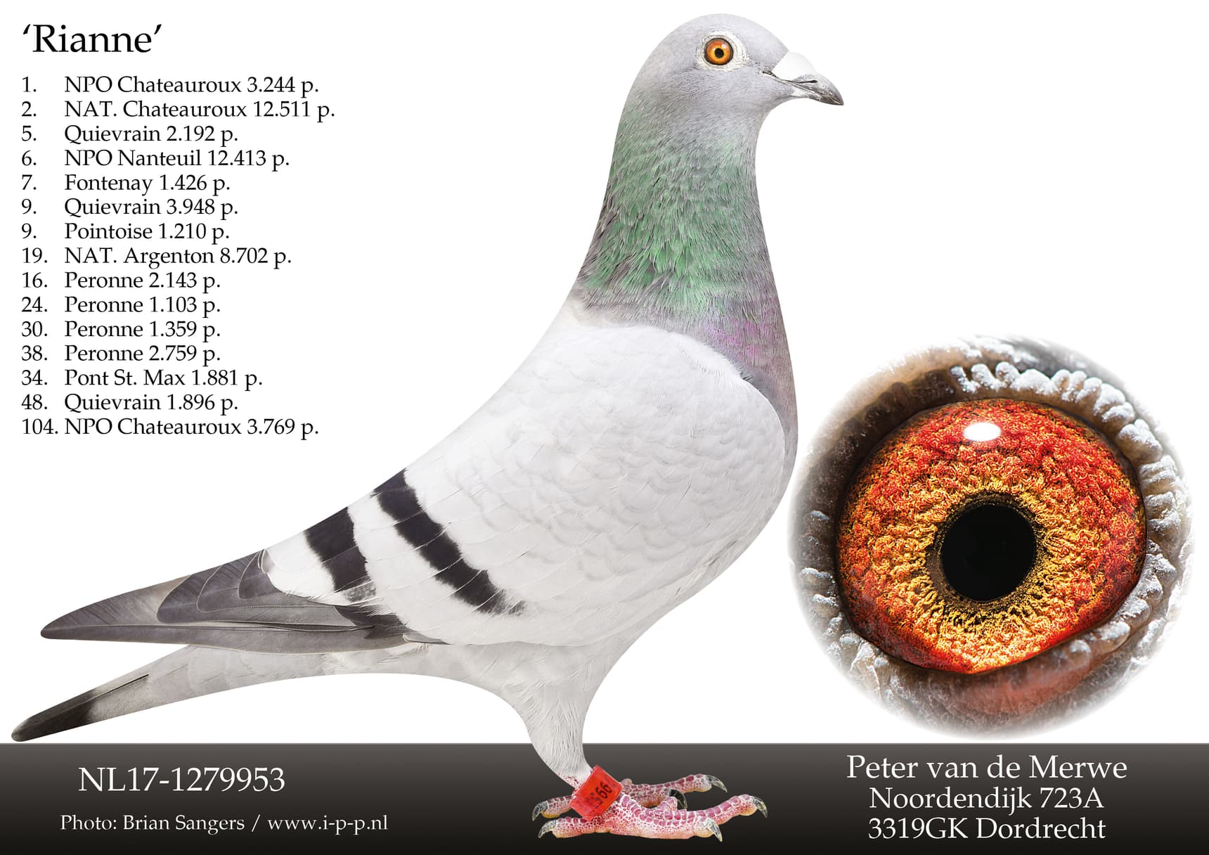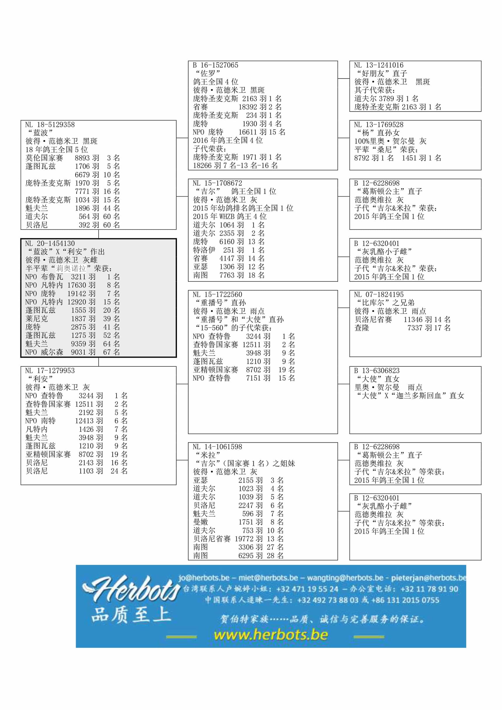“蓝波”直女. “蓝波” 荣获: 18年鸽王全国5位 – 莫伦国家赛 8,893羽3名 – NPO 蓬图瓦兹 6,679羽10名 - NPO 庞特 7,771羽16名“利安”直女,“利安”荣获: NPO 查特鲁 3,244羽1名 – 查特鲁国家赛12,511羽2名 – NPO 南图 12,413羽6名