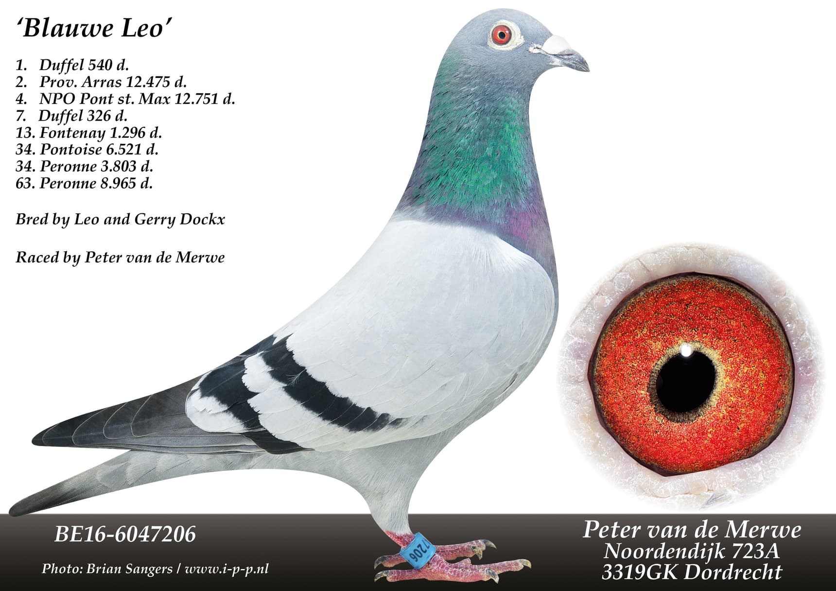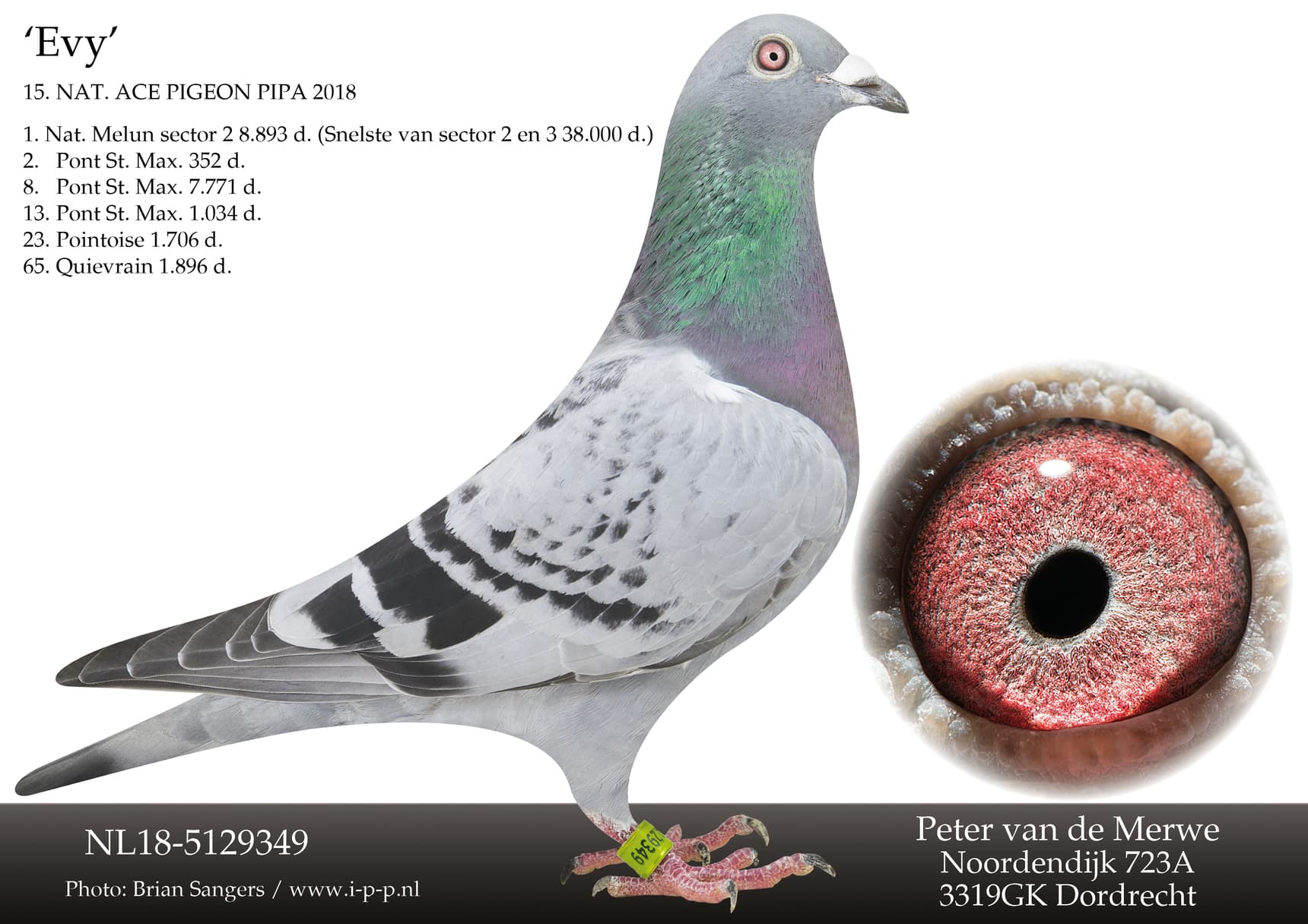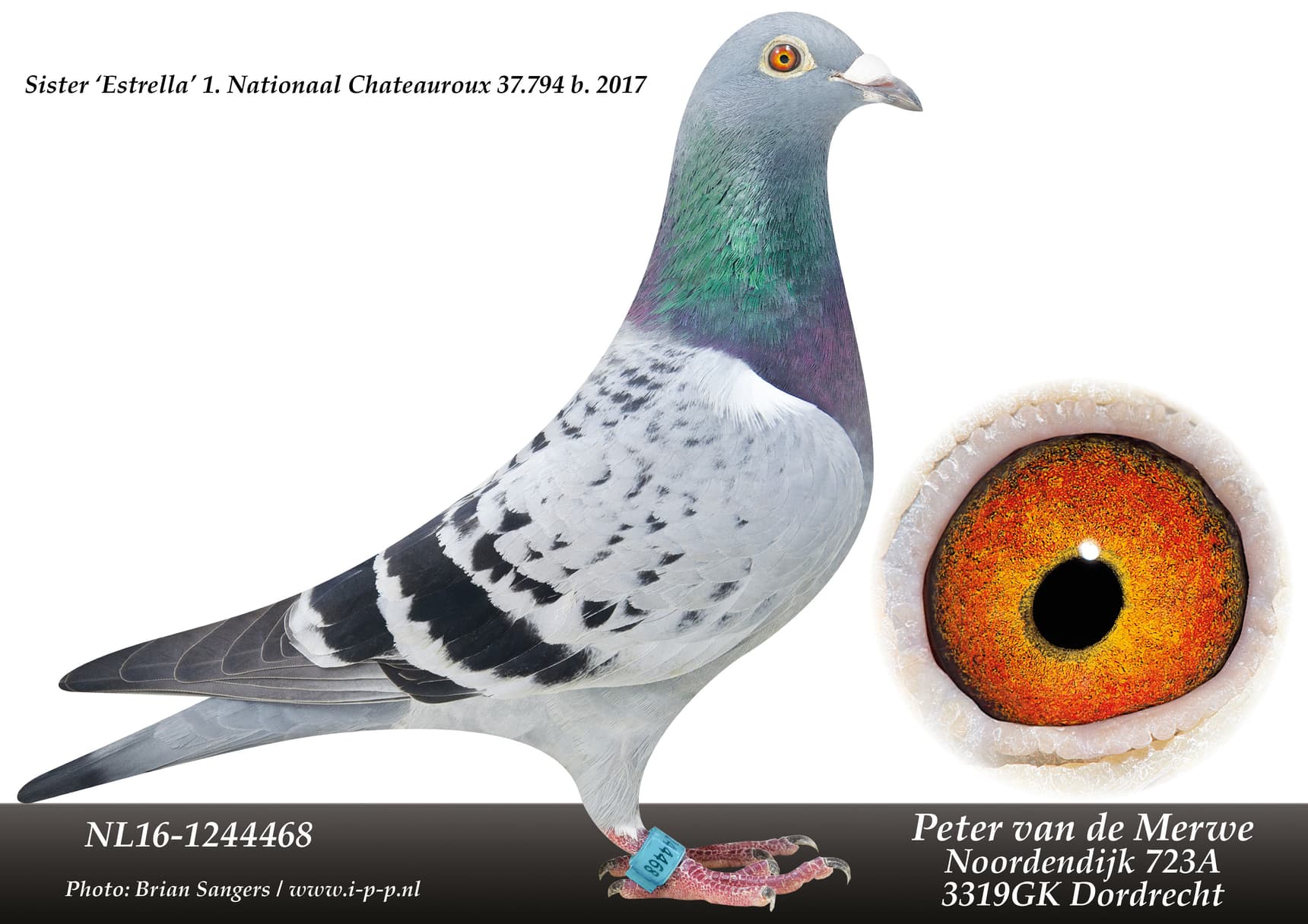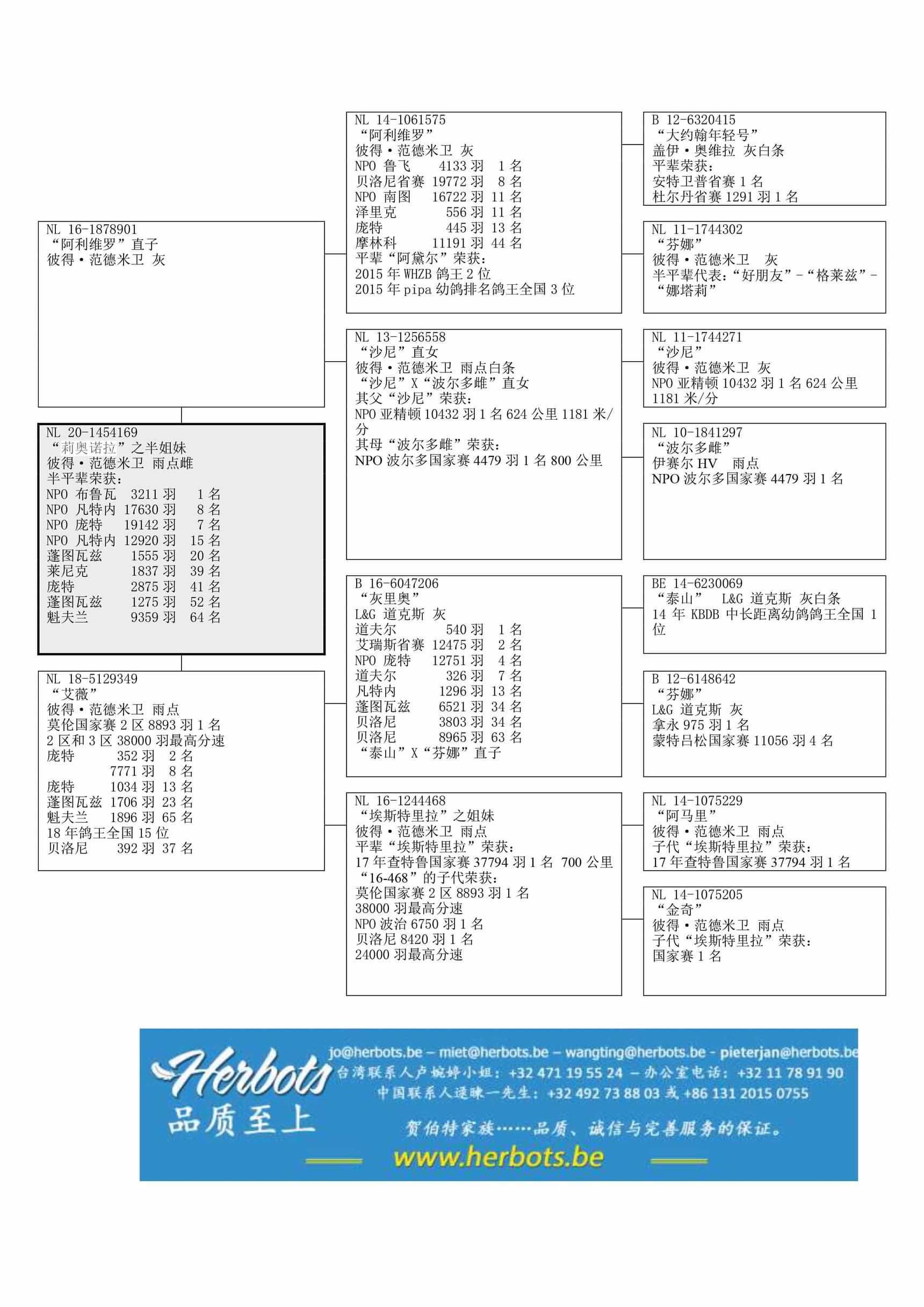 “罗米尔”之全姐妹. “罗米尔” 荣获: 2020年长距离之窗鸽王全国2位 – NPO 庞特 19,399羽7名 “莉奥诺拉”之半姐妹.“莉奥诺拉” 荣获: 2020年鸽王全国3位 – NPO 布鲁瓦 3,211羽1名 – NPO 凡特内 17,630羽8名 – NPO 凡特内 12,920羽15名“艾薇”直女. “艾薇” 荣获:莫伦国家赛 8,893羽1名 – 分速 38.000羽1名