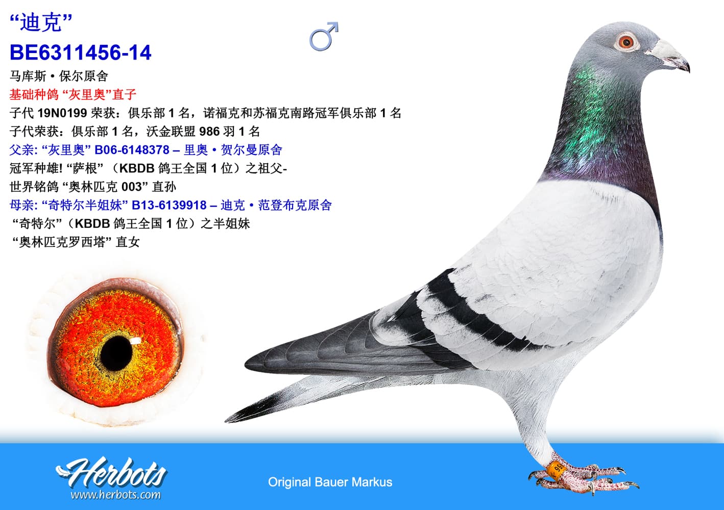 “萨根”X“特别之事”(“好红号”X“奥林匹克罗西塔”直女)之孙“萨根”荣获:KBDB 短距离鸽王全国1 位基础种鸽“灰里奥”X“奥林匹克罗西塔直女”之孙