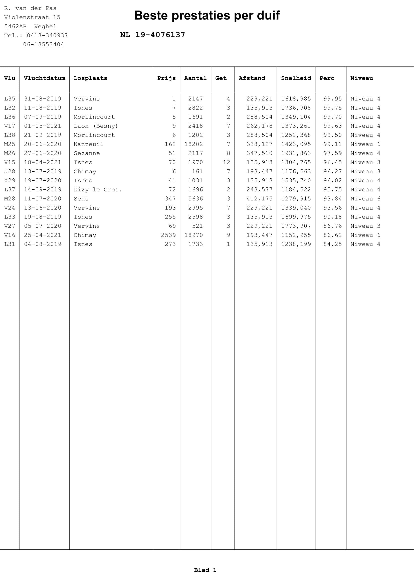 2019年PIPA排行榜,荷兰幼鸽组最佳速度赛鸽5名