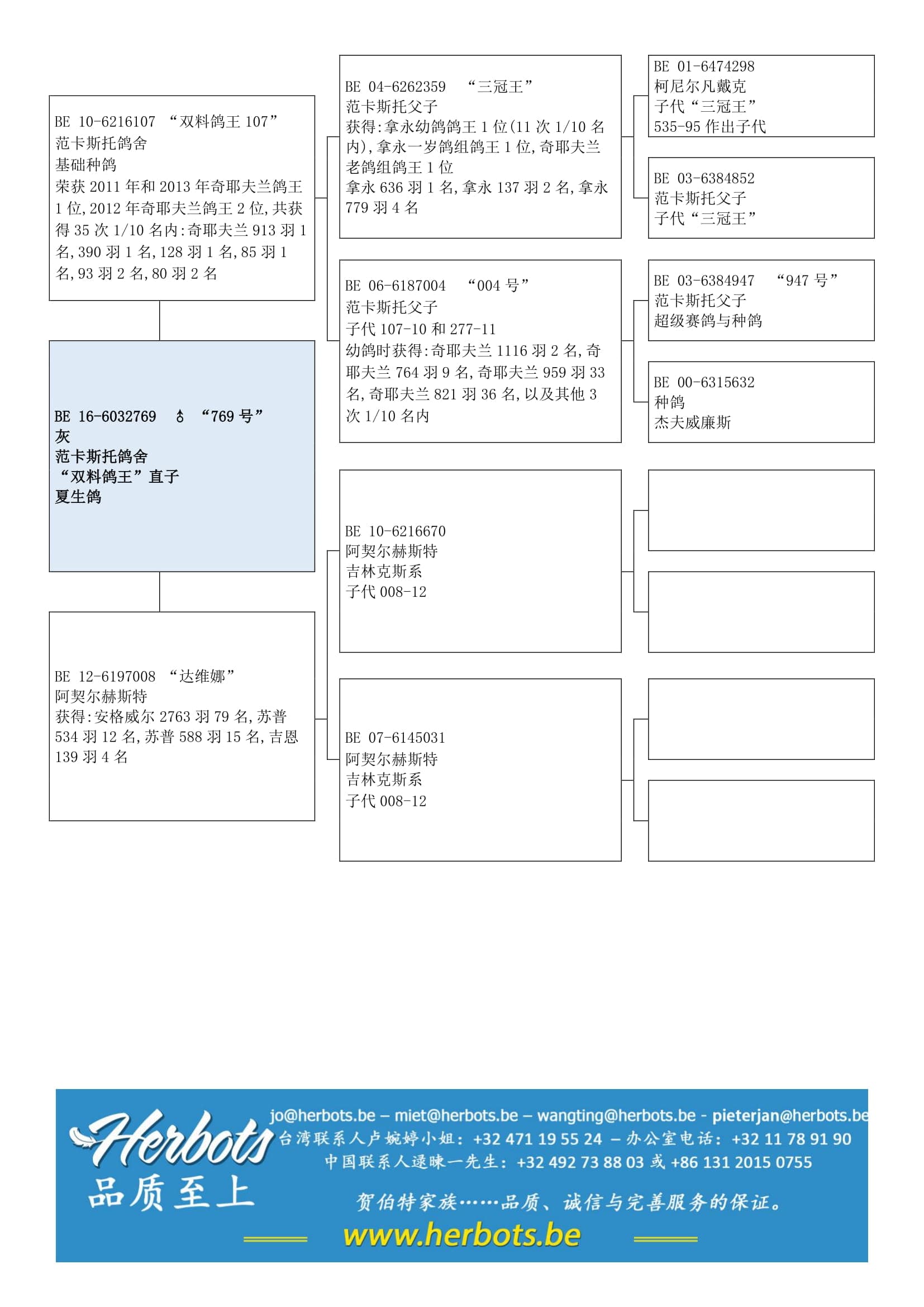 荣获: 2011 & 2013年奇耶夫兰俱乐部鸽王1位-2012年奇耶夫兰俱乐部鸽王2位–4次1名