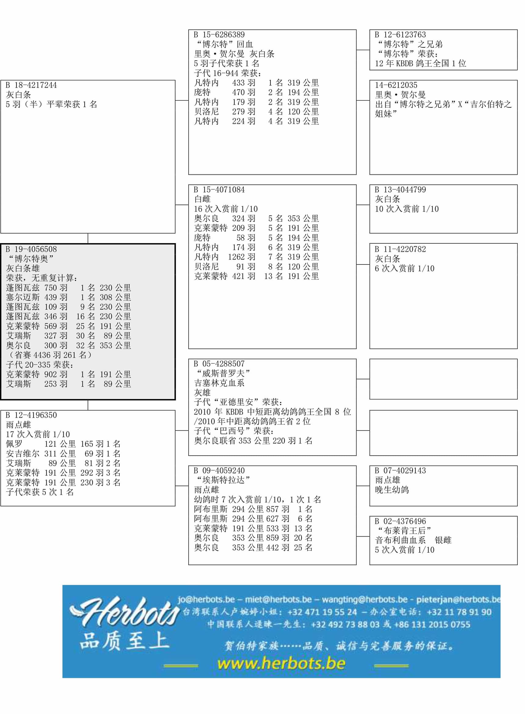 荣获 – 无重复计算: 蓬图瓦兹 750羽 1名 230公里塞尔迈斯 439羽 1名 308公里蓬图瓦兹 109羽 9名 230公里蓬图瓦兹 346羽 16名 230公里克莱蒙特 569羽 25名 191公里艾瑞斯 327羽 30名 89公里奥尔良省赛 4,436羽 261名 353公里子代“335-20”荣获:克莱蒙特 902羽1名 – 艾瑞斯 253羽1名