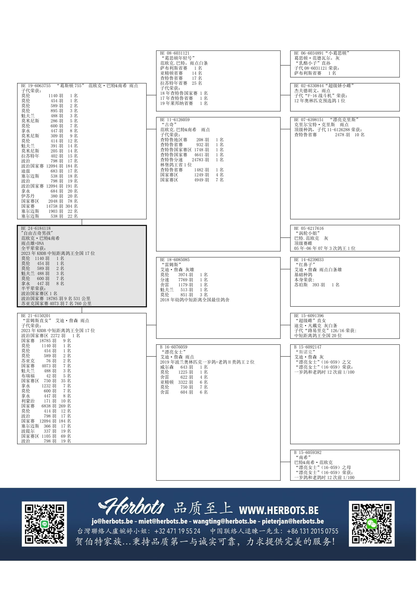 雷姆斯” (舍雷 1,179羽1名 – 魁夫兰 513羽1名 - 莫伦 3,974羽1名 (省赛一岁鸽组分速7,769羽1名- 莫伦 851羽3名 – 等等) x  “漂亮女士” (2019年波兹南奥林匹克H类鸽王 – 威尔森 643羽1名 – 莫伦 1,225羽1名 - 舍雷622羽4名 – 舍雷 604羽6名 – 亚精顿 3,322羽6名- 莫伦  750羽7名 - 舍雷 1,482羽7名 – 波治 3,621羽9名 – 等等)  作出
