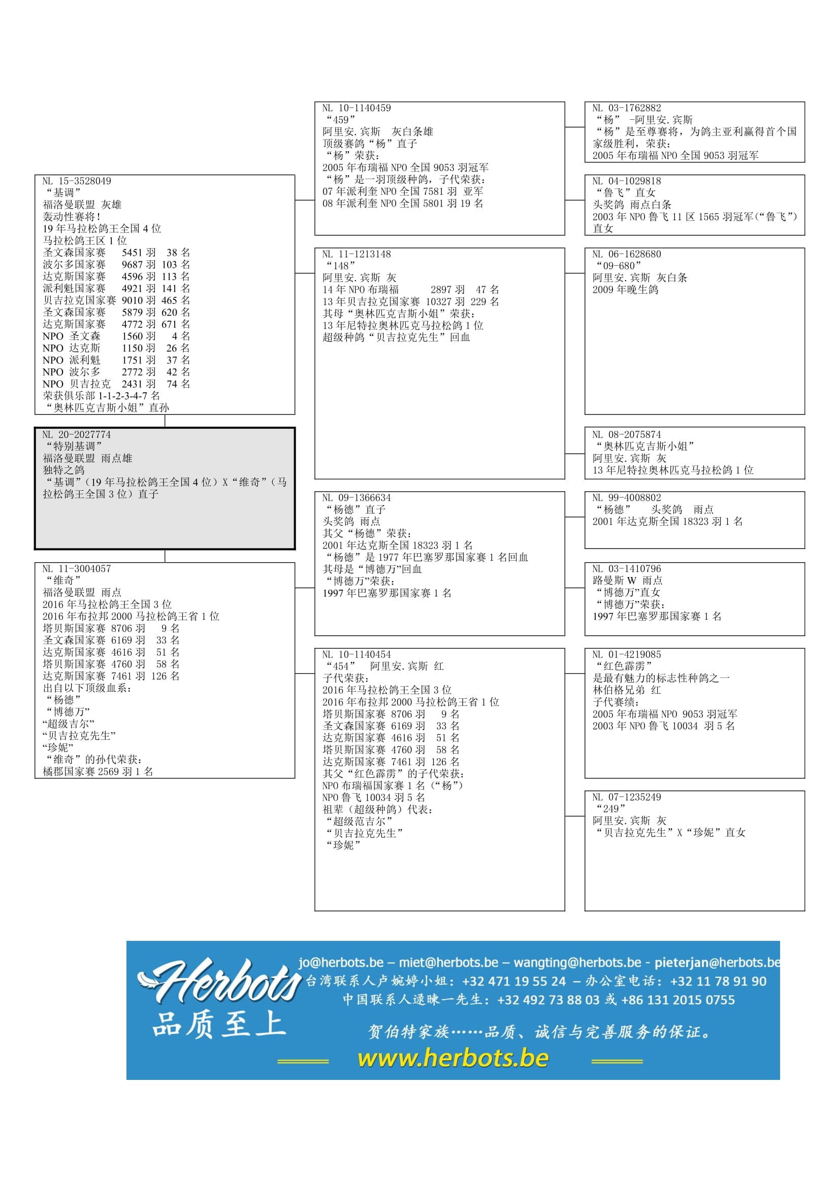 荣获: 16年布拉邦2000马拉松鸽王省1位 - 2016年马拉松鸽王全国3位 – 塔贝斯国家赛 8,706羽9名– 圣文森国家赛 6,169羽33名 – 达克斯国家赛 4,616羽51名 – 塔贝斯国家赛 4,760羽58名