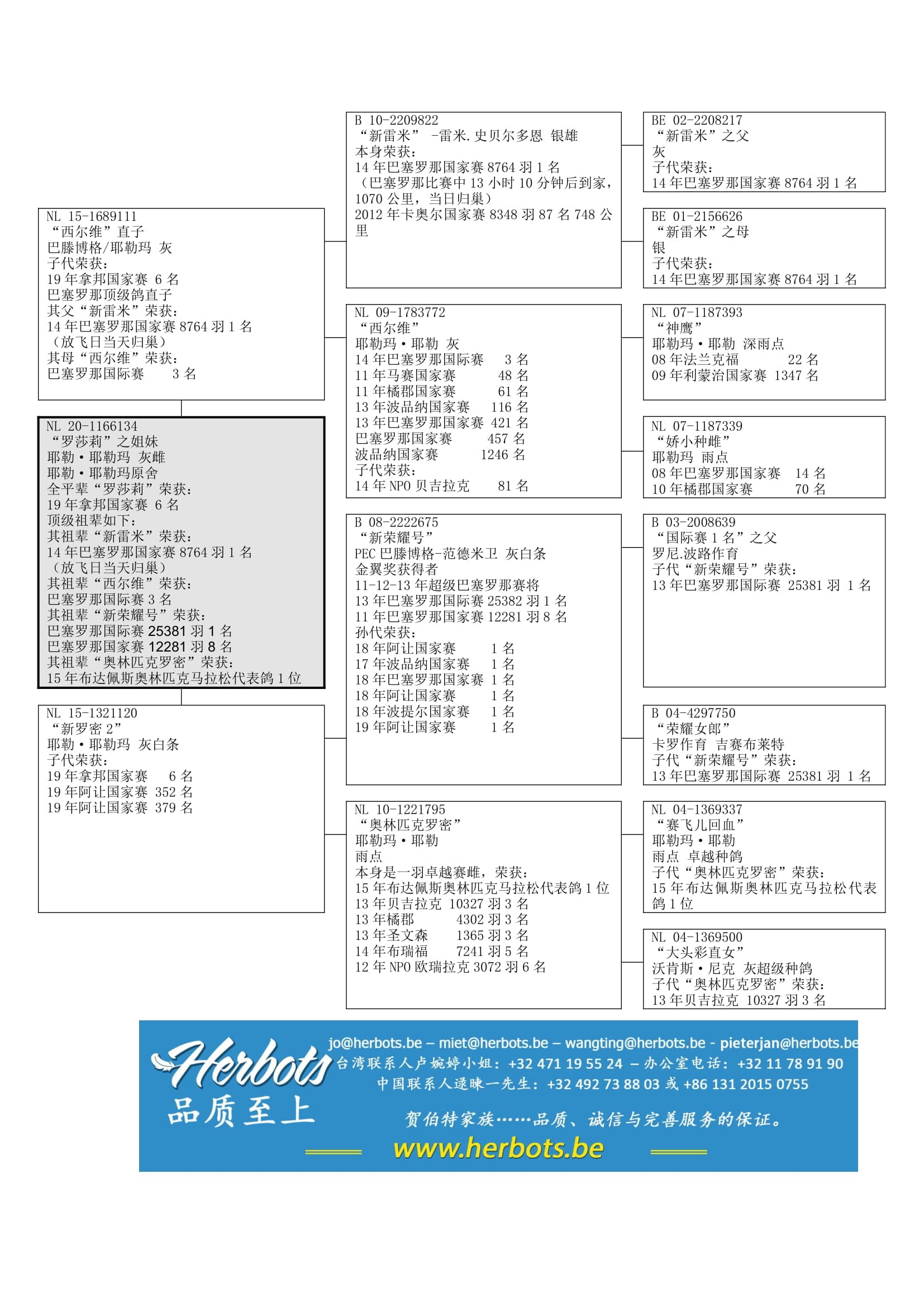 “新荣耀号” (巴塞罗那国际赛 25,381羽1名) x “罗密” ( 荣获: 布达佩斯奥林匹克马拉松代表鸽 - 贝吉拉克国家赛 10,327羽3名 - 橘郡国家赛4,302羽3名 - NPO 圣文森 1,365羽3名 - 布瑞福国家赛 7,241羽5名 - NPO 欧瑞拉克 3,072羽6名)直女