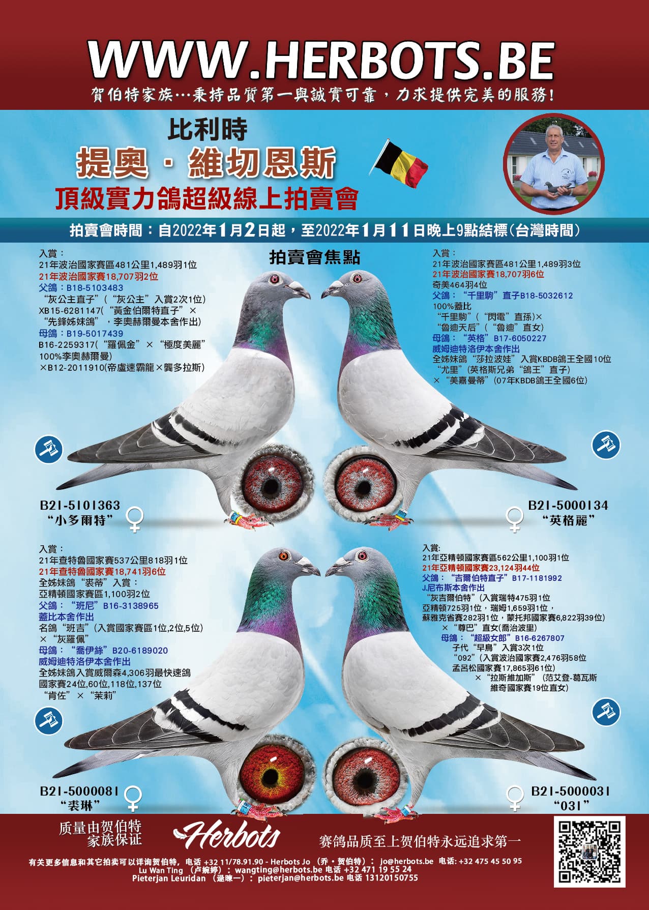 “法贝热” (查特鲁国家赛1名 – 45,859羽分速最高) x 他的母亲 “伊莎贝尔” (子代代表及佳绩:“法贝热”- “灰法贝热”, 查特鲁国家赛 26,881羽19名以及“416-20”- 波治国家赛2名) 直子