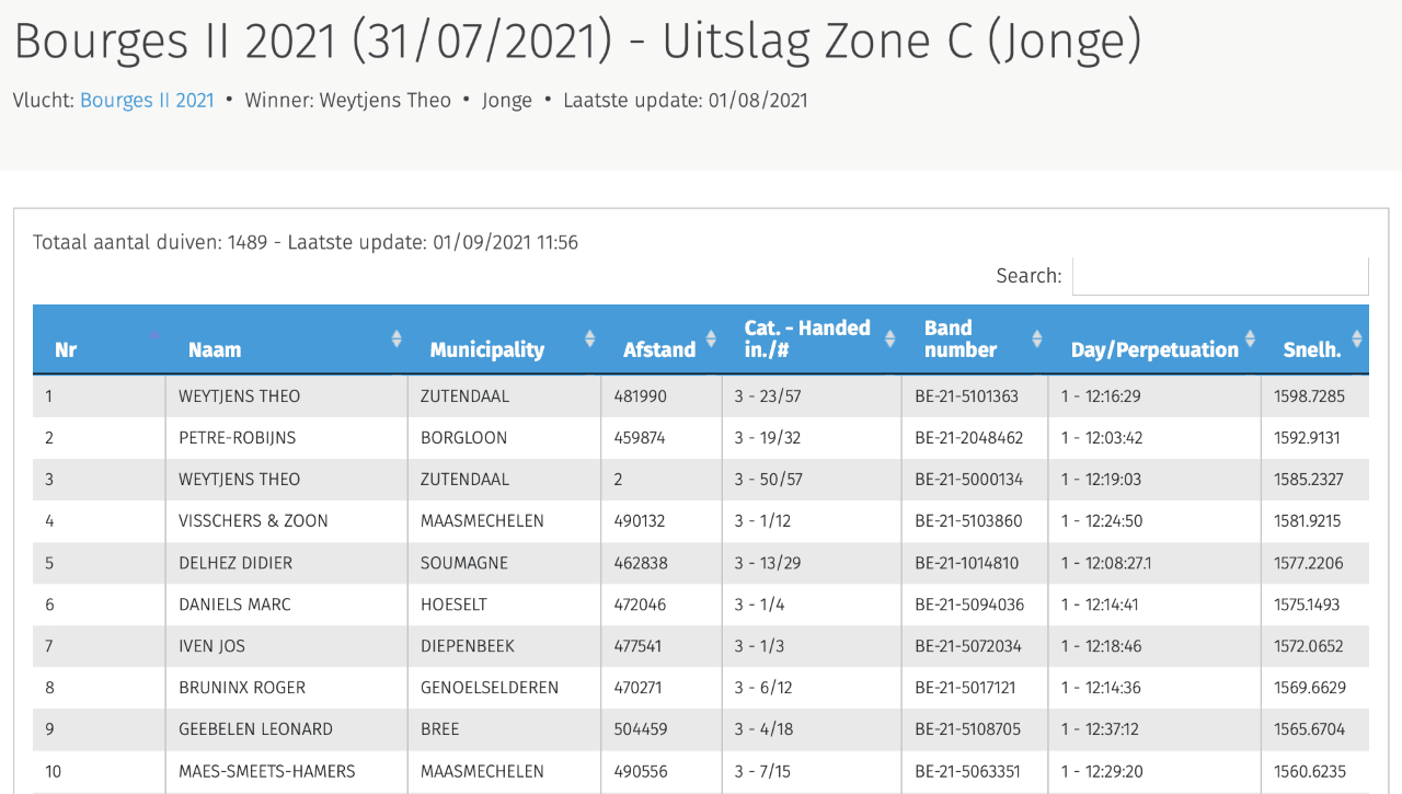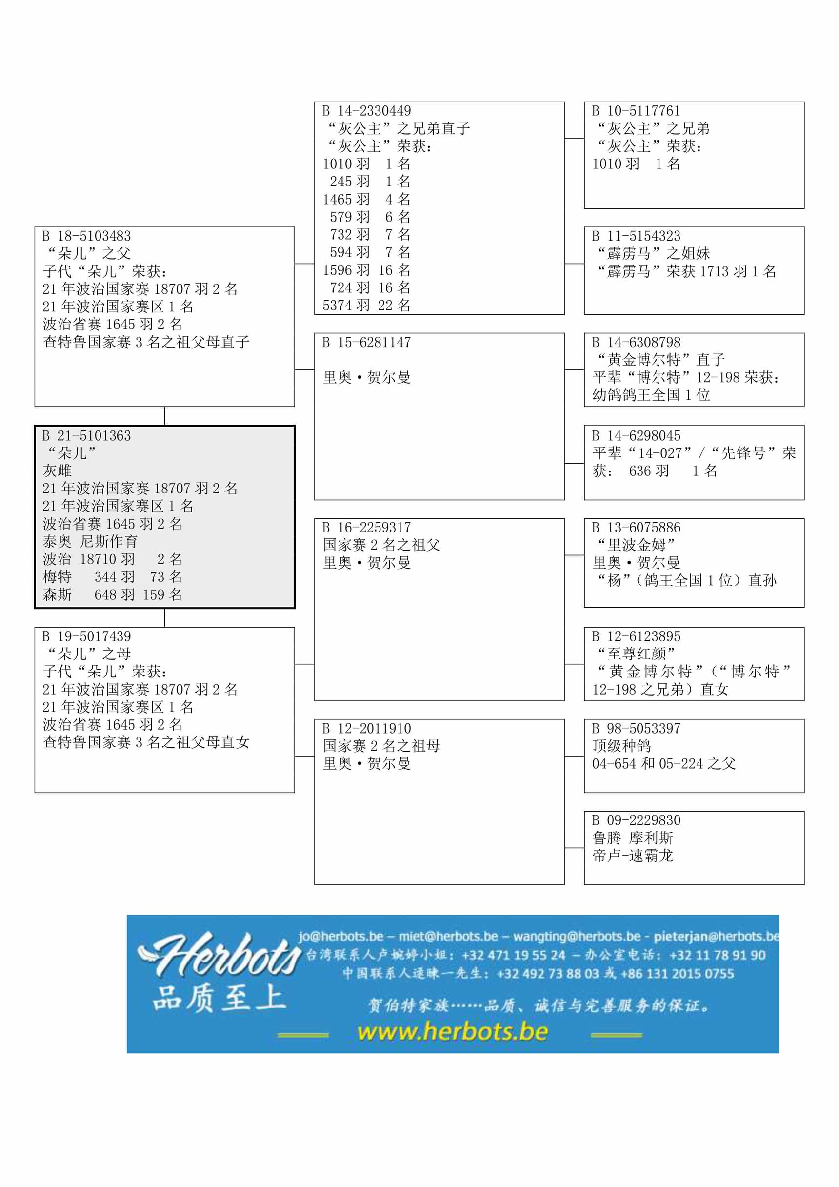 “灰公主之兄弟直子” (“灰公主” 荣获: 1,010羽1名 – 245羽1名 – 1,465羽4名– 579羽6名 – 732羽7名 – 594羽7名 – 1,596羽16名 – 5,374羽22名) x “B15-6281147” (里奥·贺尔曼原舍 – “黄金博尔特直子”x “先锋号之姐妹”直子;“黄金博尔特”是铭鸽“博尔特”之兄弟- ) 直子