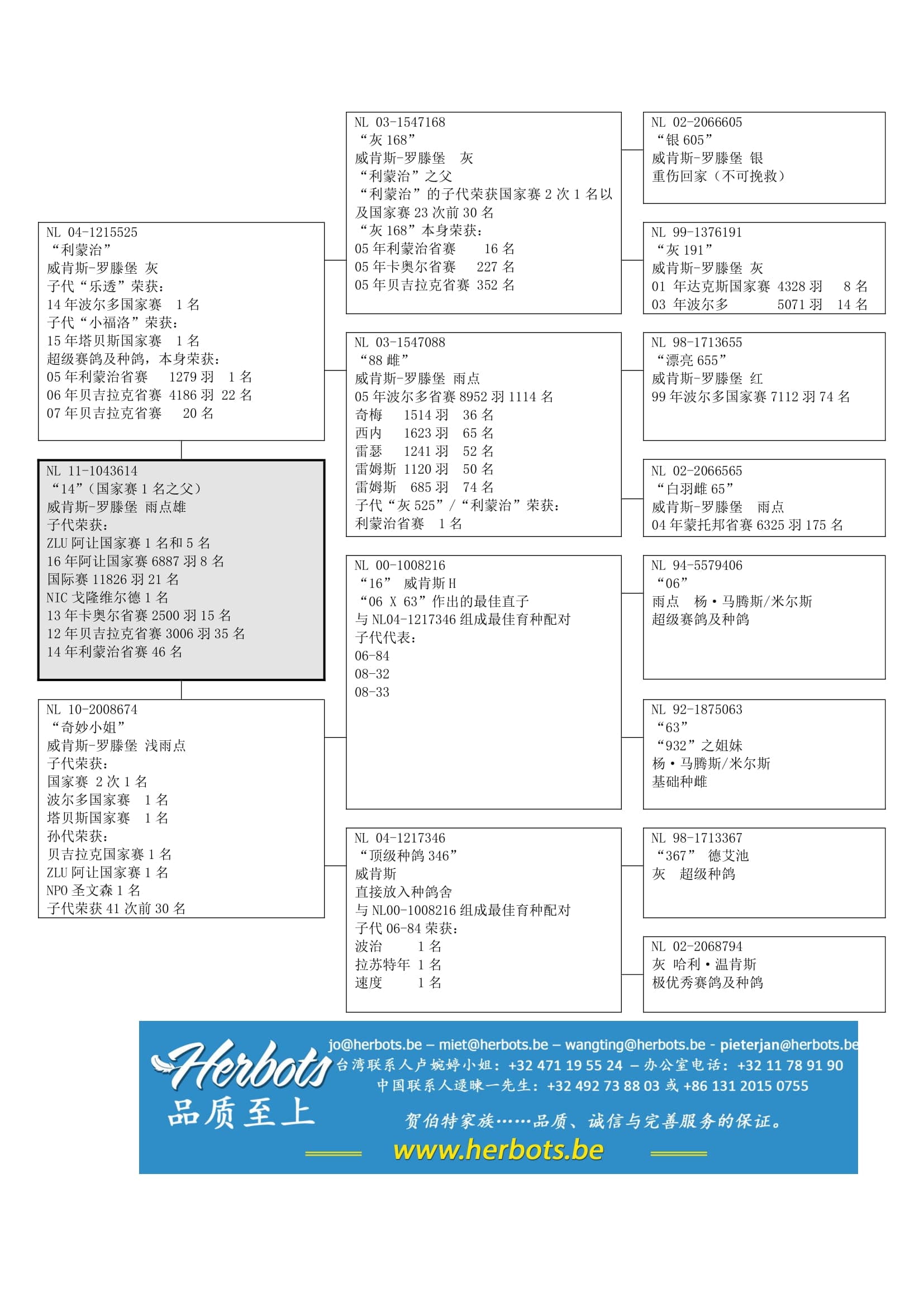 荣获 :利蒙治省赛 1,279羽1名;其子代代表:“乐透” (14年波尔多国家赛1名) 和“小福洛” (15年塔贝斯国家赛1名)