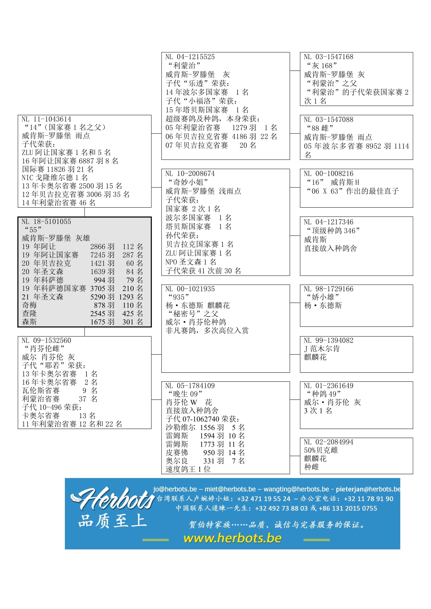 荣获 :利蒙治省赛 1,279羽1名;其子代代表:“乐透” (14年波尔多国家赛1名) 和“小福洛” (15年塔贝斯国家赛1名)