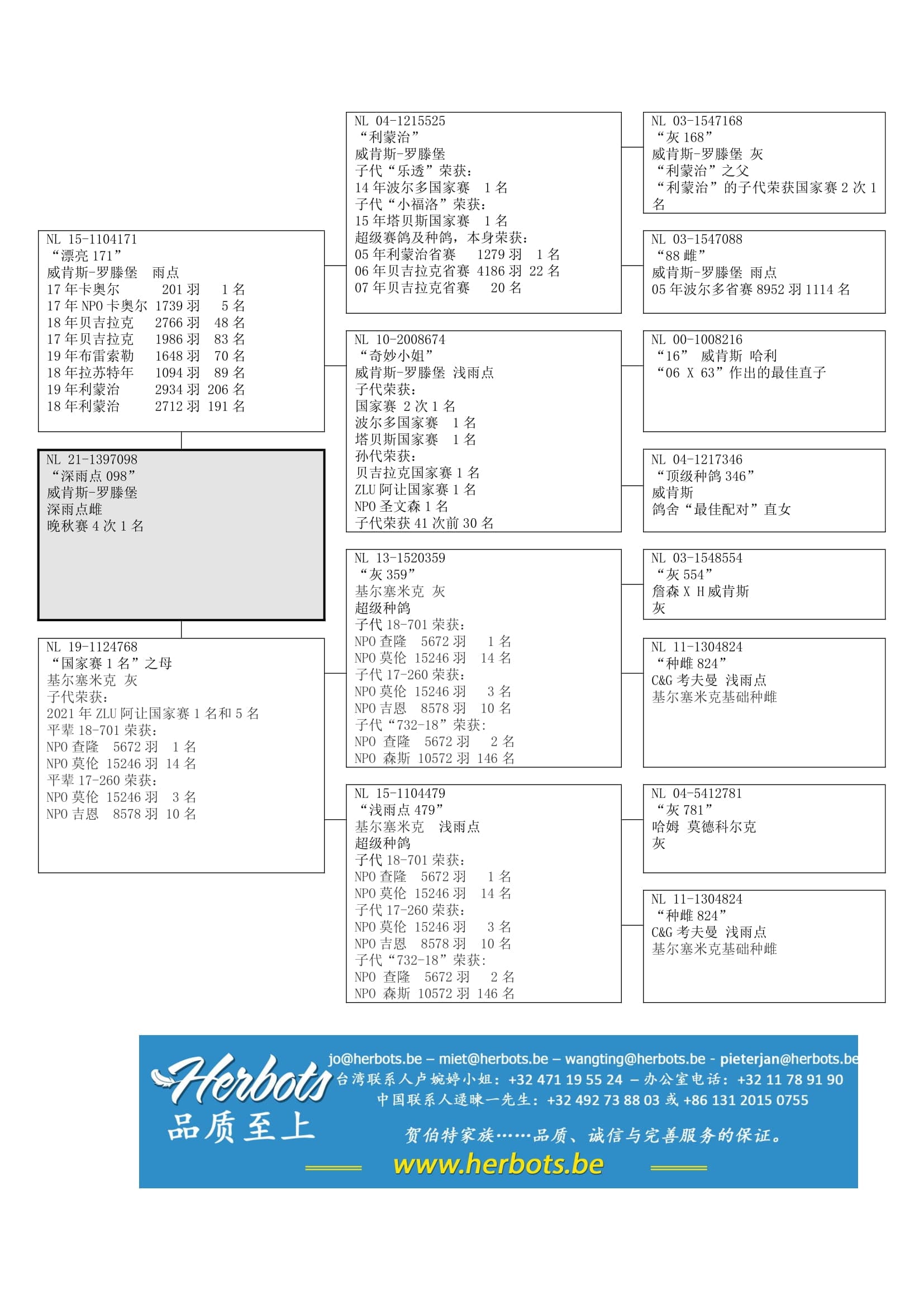 荣获 :利蒙治省赛 1,279羽1名;其子代代表:“乐透” (14年波尔多国家赛1名) 和“小福洛” (15年塔贝斯国家赛1名)