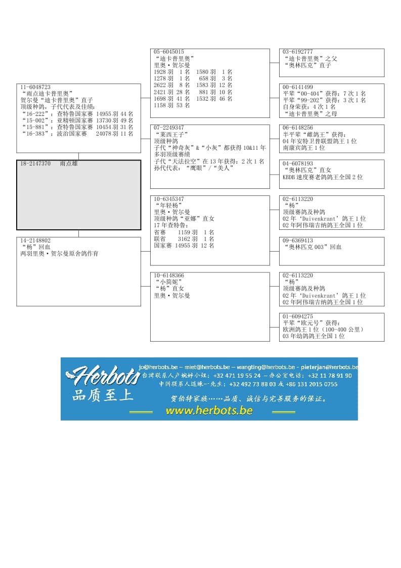 “迪卡普里奥”/“杨”之孙100%里奥·贺尔曼半平辈获得:波治国家赛 466公里 24078羽 11名查特鲁国家赛 517公里 10454羽 31名查特鲁国家赛 517公里 14955羽 44名亚精顿国家赛 546公里 13730羽 49名