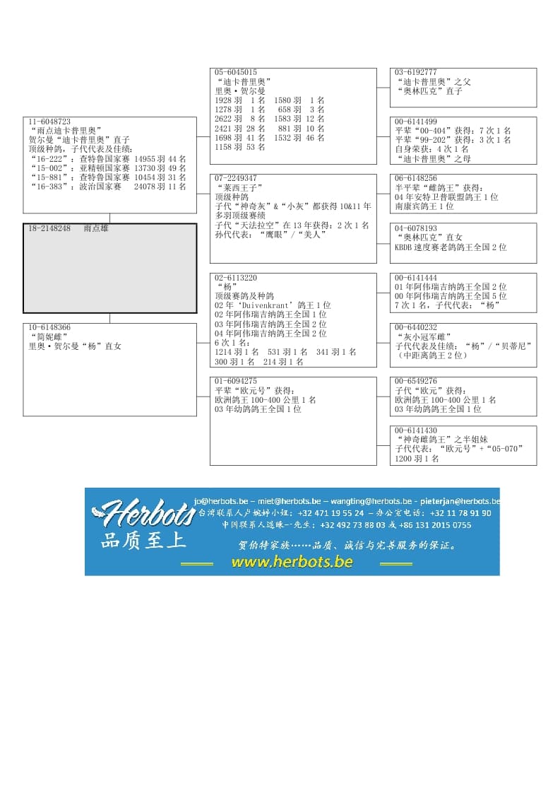 “迪卡普里奥”/“杨”/“欧元号之姐妹”之孙100%里奥·贺尔曼半平辈获得:波治国家赛 466公里 24078羽 11名查特鲁国家赛 517公里 10454羽 31名查特鲁国家赛 517公里 14955羽 44名亚精顿国家赛 546公里 13730羽 49名
