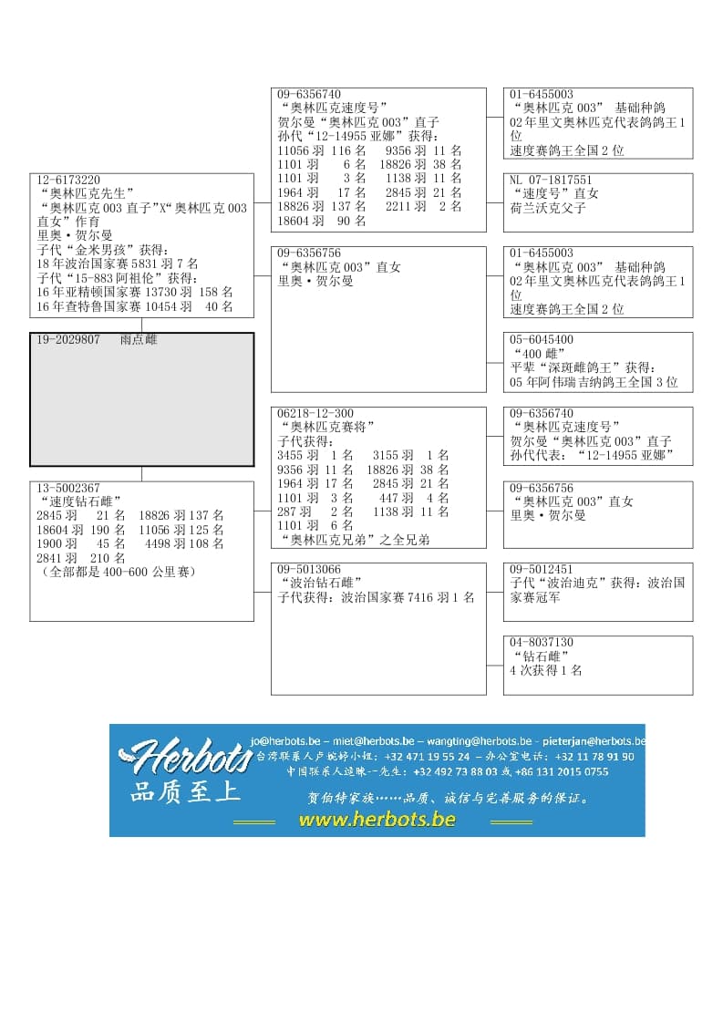 顶级种鸽“奥林匹克先生”直女半平辈“基米男孩”获得:波治国家赛 466公里 5831羽 7名半平辈“阿祖伦”获得:查特鲁国家赛 517公里 10454羽 40名亚精顿国家赛 546公里 13730羽 158名
