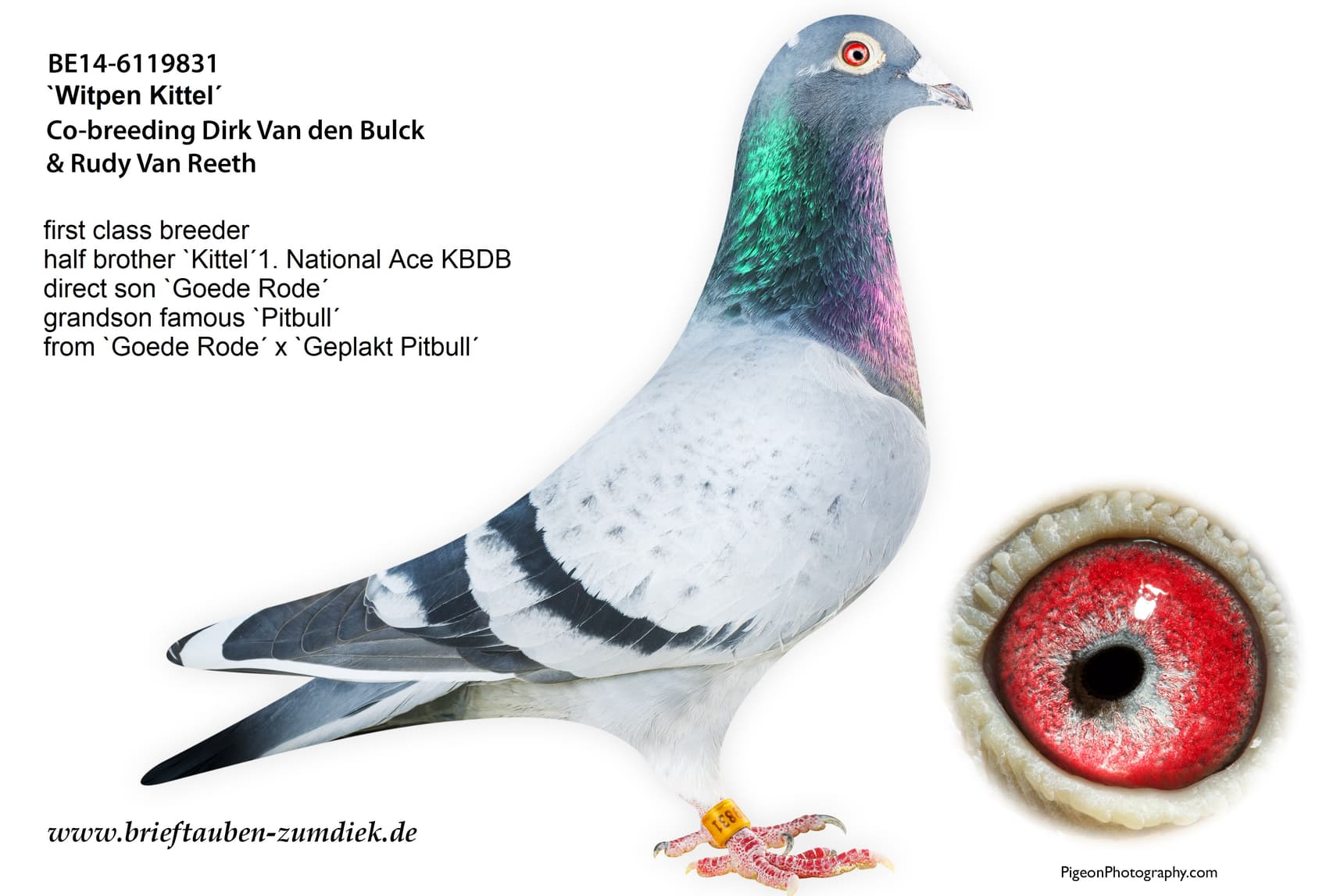 “新奇特尔”直孙女. “新奇特尔” 荣获: 2014年布达佩斯奥林匹克代表鸽1,371羽1名 – 1,993羽3名 – 1,571羽8名 – 2,126羽26名等“好红”直孙女. “好红”是迪克·范登布克的基础种鸽。“好红” 的后代荣获:KBDB鸽王全国1-1-1-2-4-6位