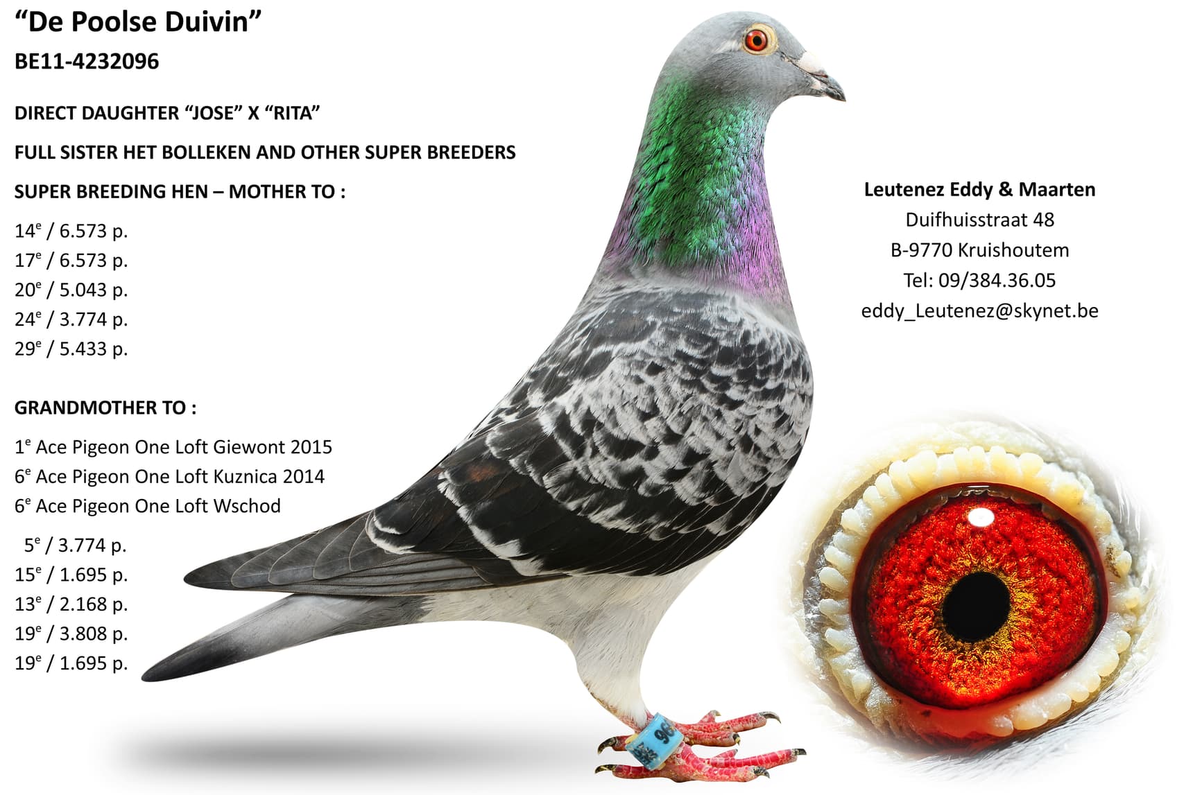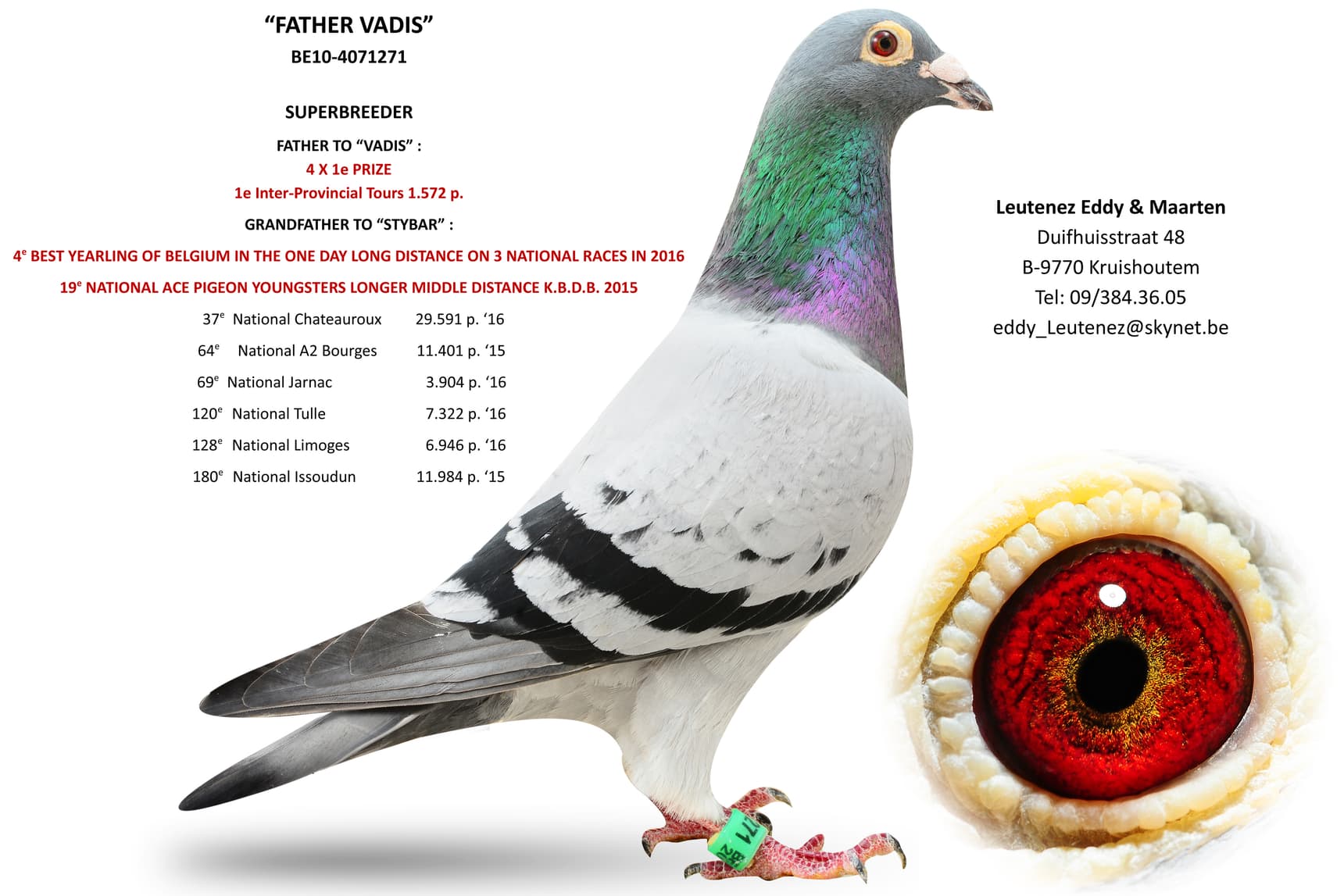 半平辈荣获: 多于 7次1名 图尔联省 1,572羽1名同父半平辈 “利亚姆” 的子代 “斯蒂巴尔” 荣获:3 场一日长距离比赛比利时最佳一岁鸽4位2016年KBDB鸽王省8位 2015年KBDB鸽王全国19位