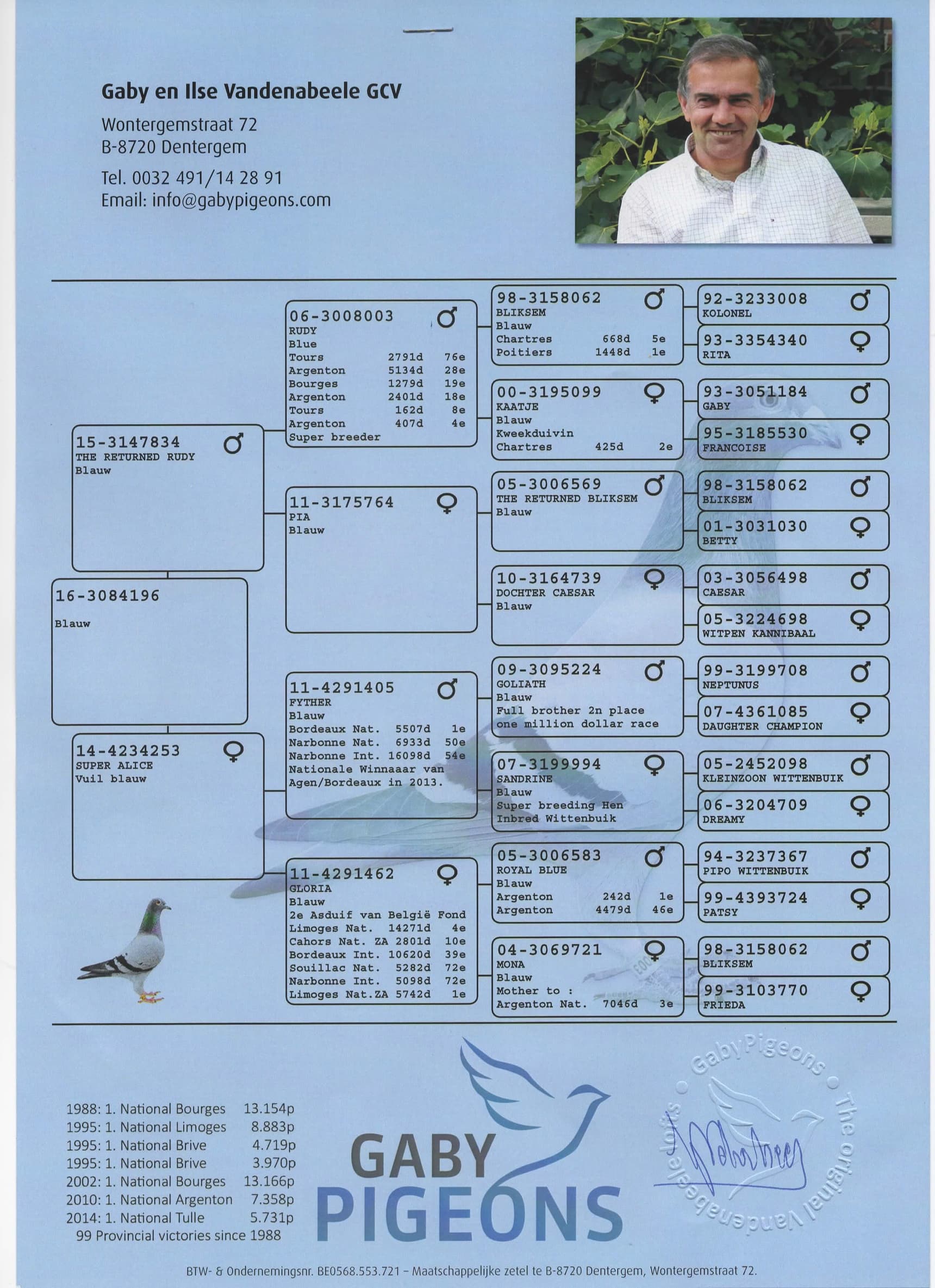 全平辈荣获: 摩林科 223羽1名 (5,046羽40名) - 庞特 226羽2名 (7,893羽8名) - 罗森达尔 275羽2名 (11,898羽44名) - 道夫尔 303羽2名 – 魁夫兰 8,186羽59名