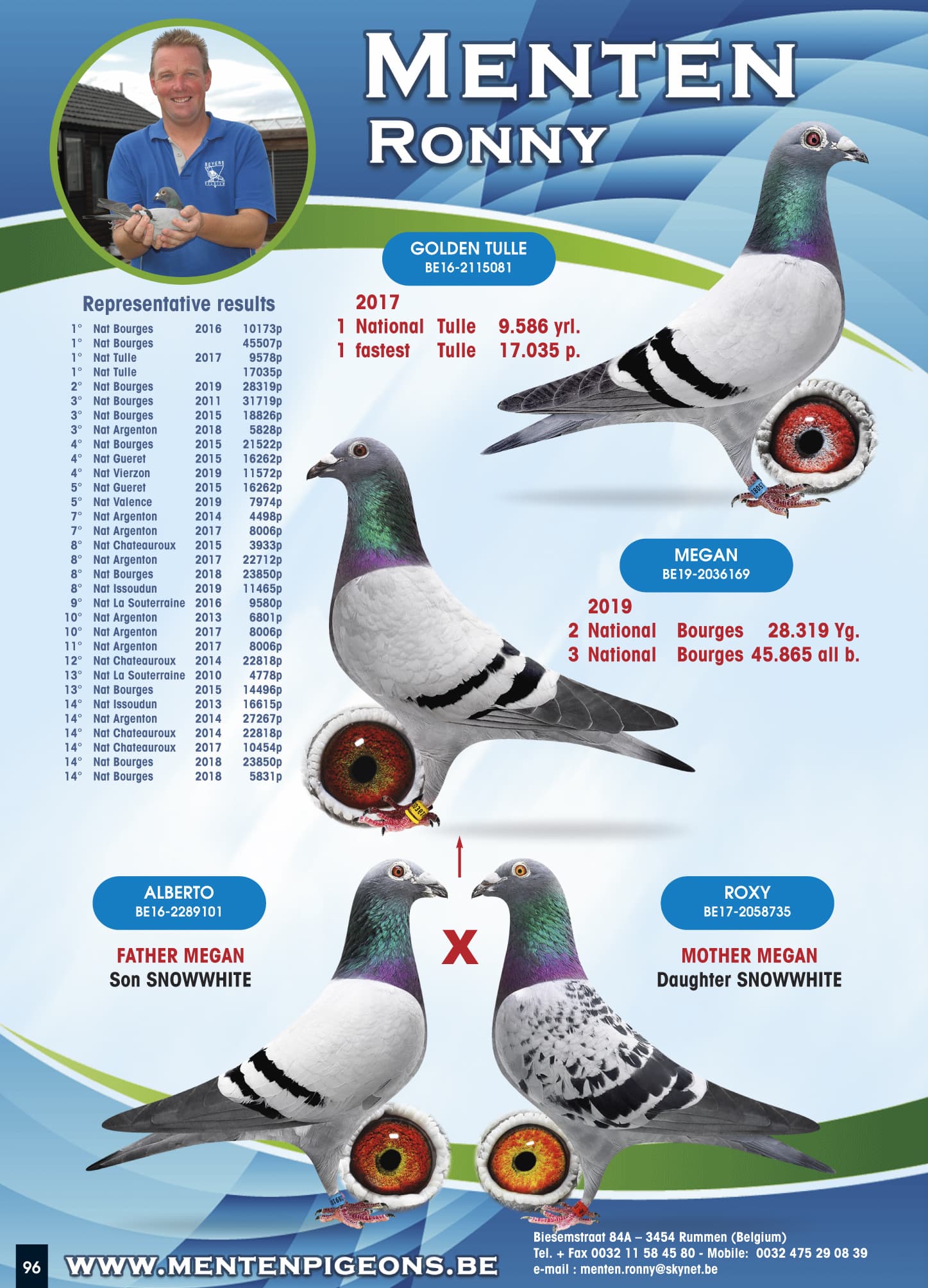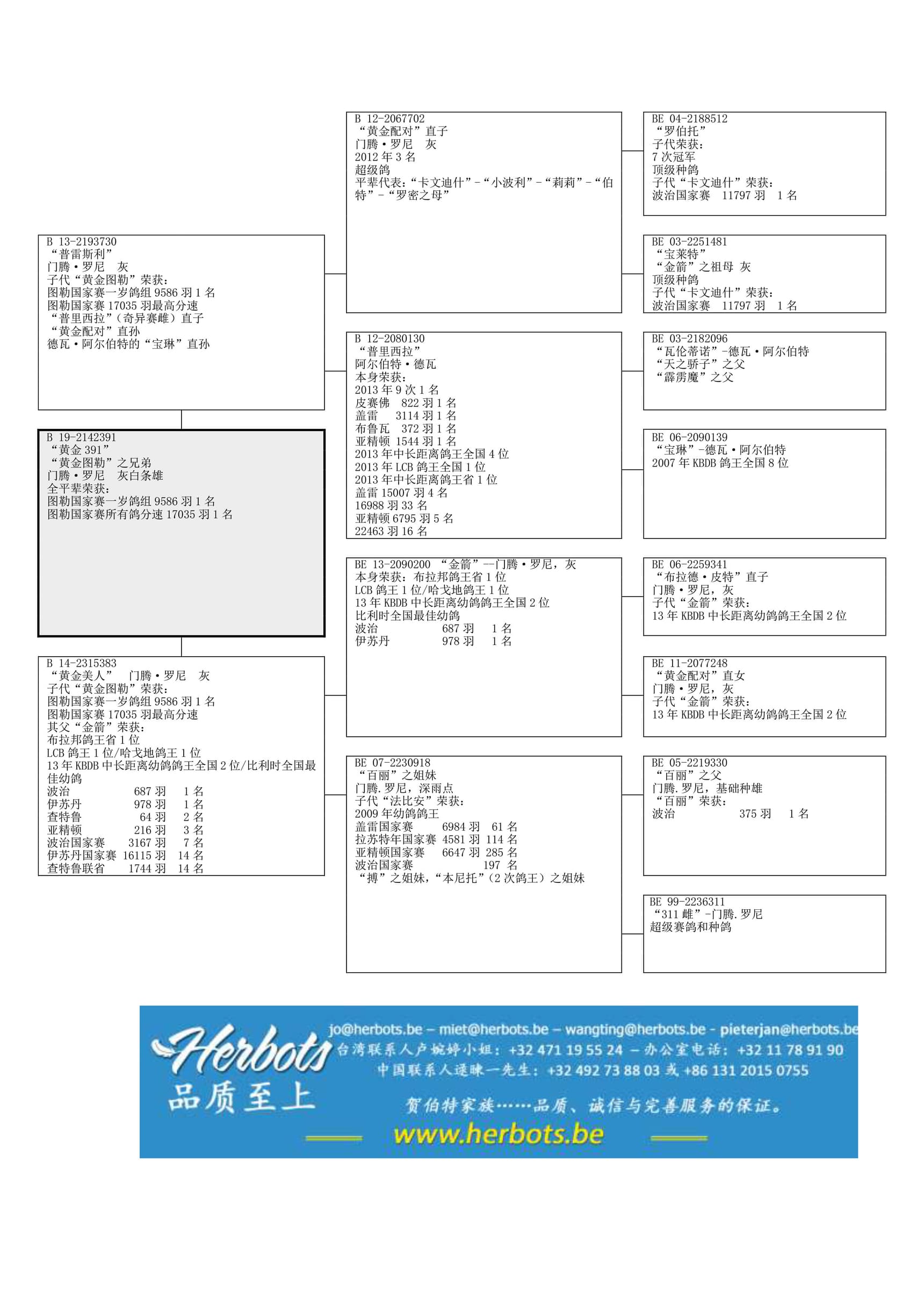 全平辈 “黄金图勒”荣获: 17年图勒国家赛一岁鸽组 9,586羽 1名 646公里(国家赛老鸽组和一岁鸽组17,035羽分速最高)其祖辈 “金箭” 荣获: KBDB 弗拉姆-布拉邦鸽王省1位 - 2013年KBDB中长距离幼鸽鸽王全国2位 - 2013年比利时国家赛最佳幼鸽