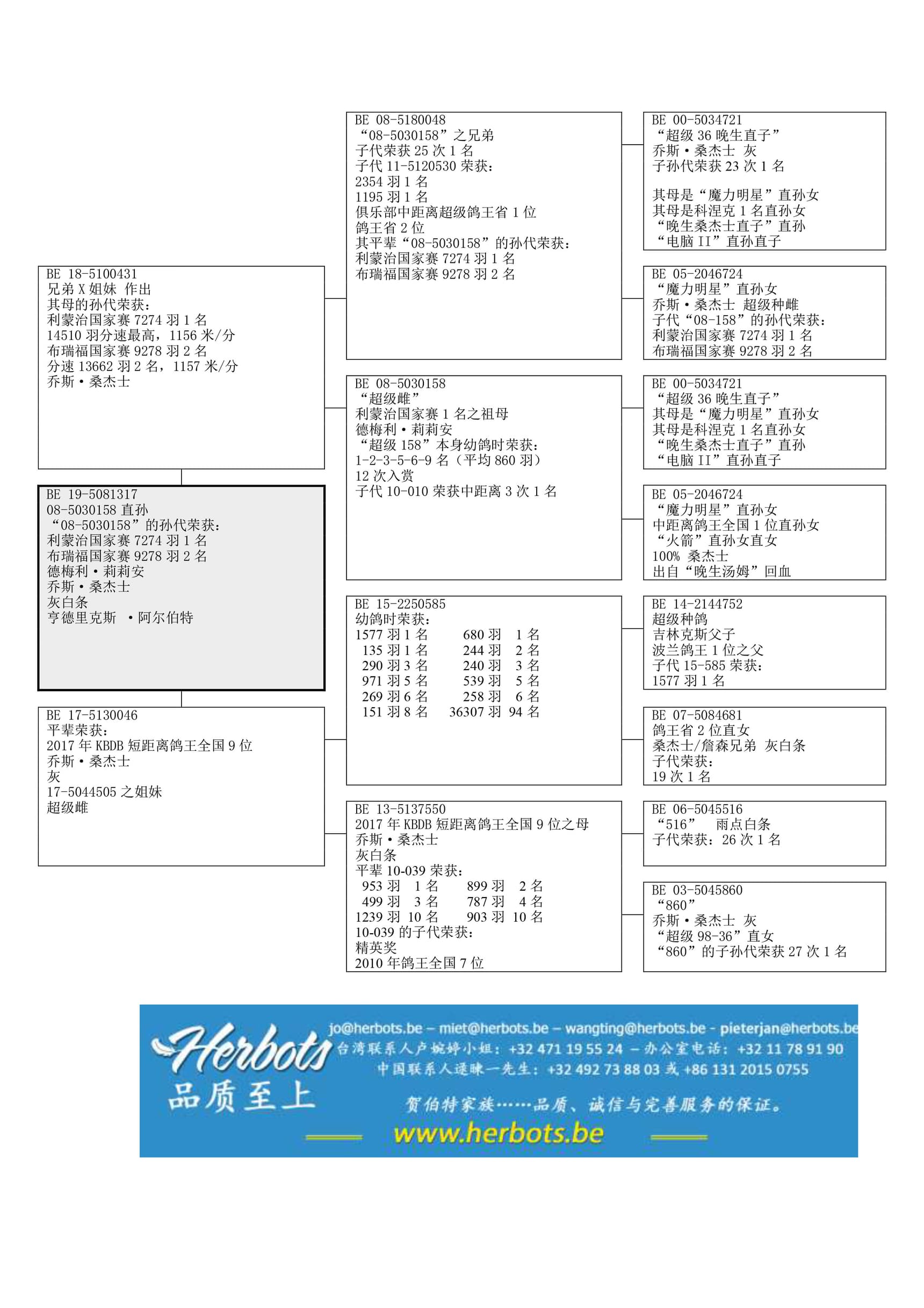 其祖辈 “158-08”的孙代 “ 独一无二先生”荣获:国家赛1名和2名,德梅利使翔其祖辈 “585-15” 荣获:3 次1名以及11 次前10名;其子代荣获2017年KBDB短距离鸽王全国9位其祖辈 “550-13”的其子代荣获2017年KBDB短距离鸽王全国9位