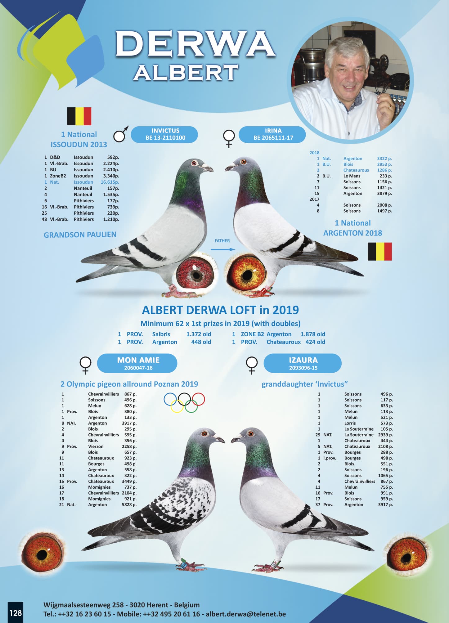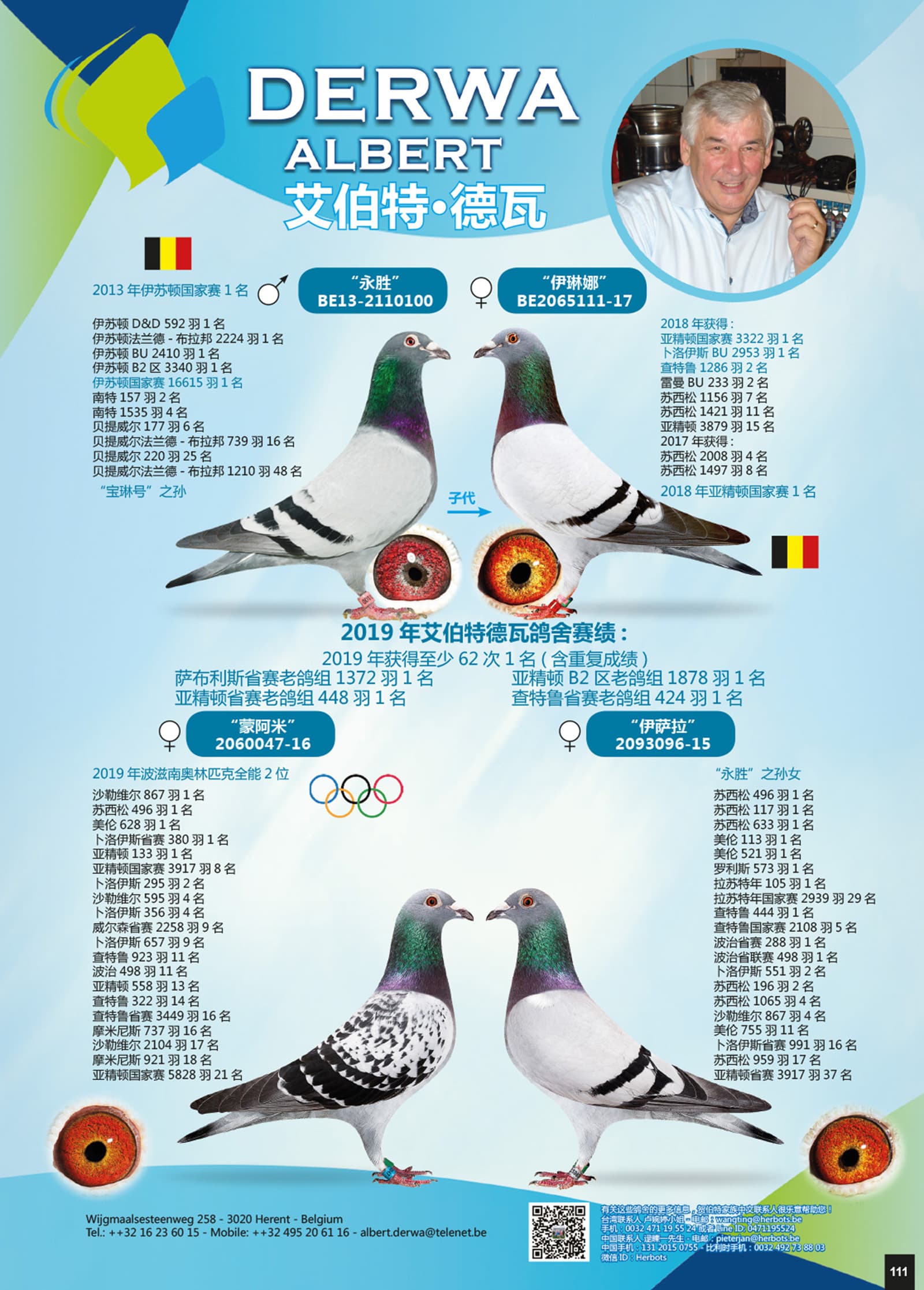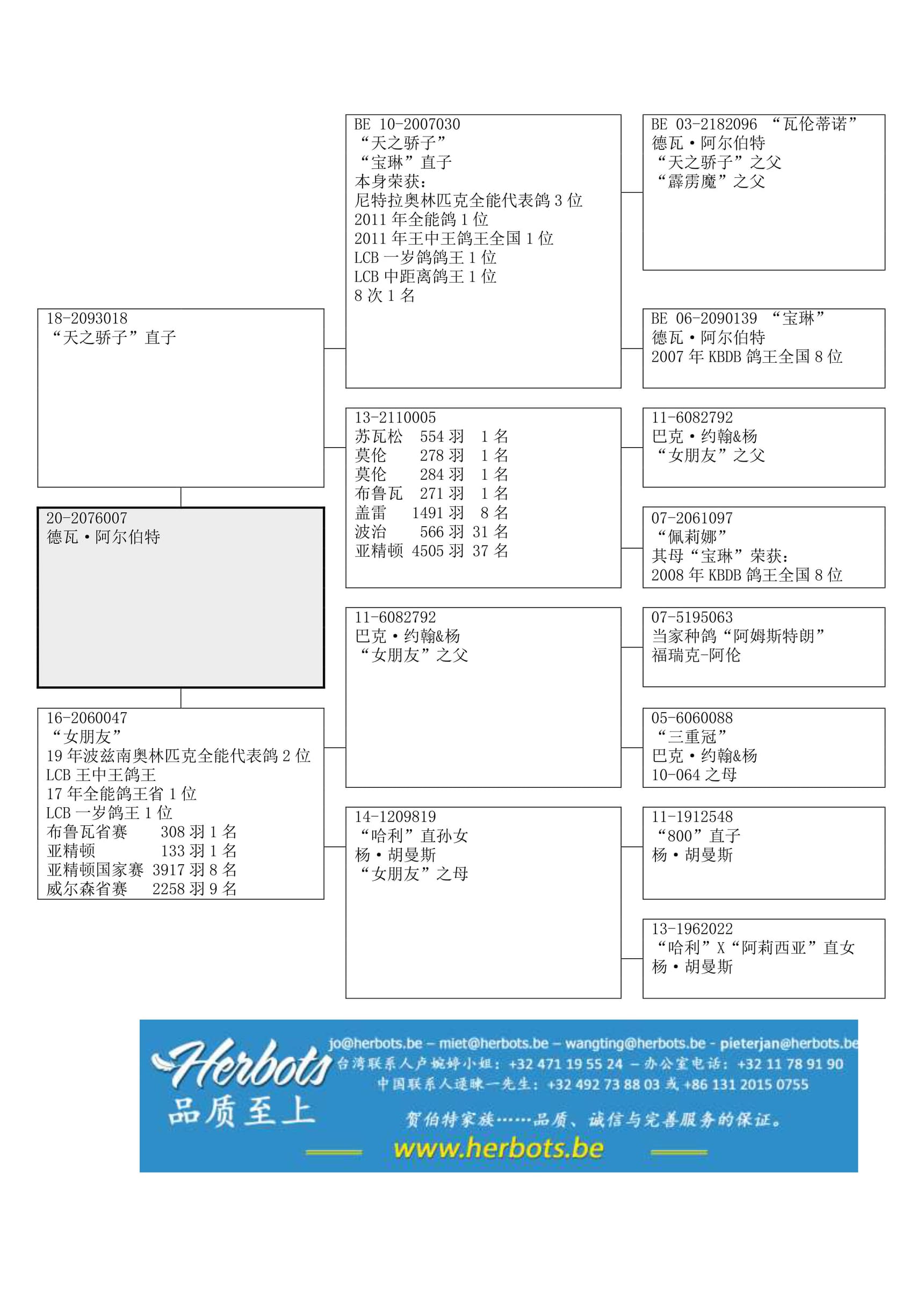 其母 “女朋友”荣获: 19年波兹南奥林匹克全能代表鸽其祖辈 “天之骄子”荣获: 2011年西欧国家杯鸽王1位 – 13年尼特拉奥林匹克代表鸽3位