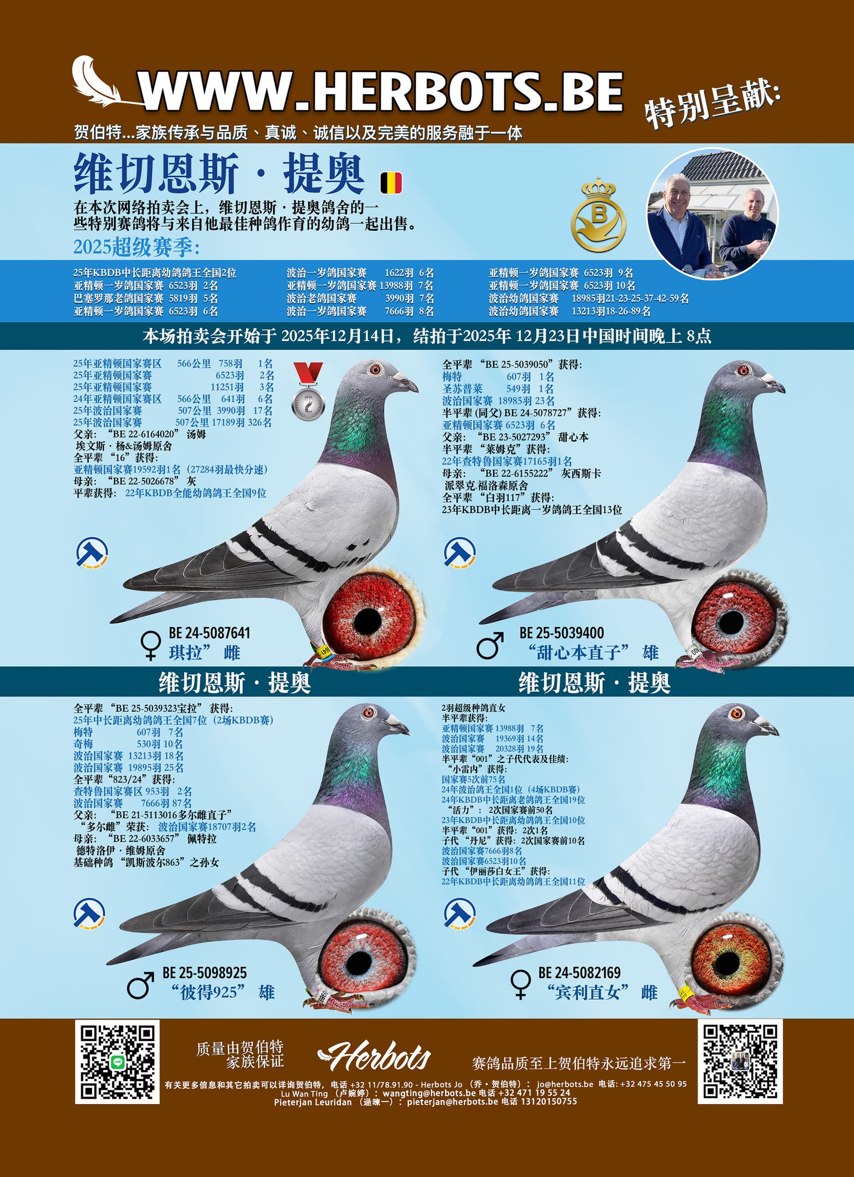 在本次网络拍卖会上,维切恩斯·提奥鸽舍的一些特别赛鸽将与来自他最佳种鸽作育的幼鸽一起出售。