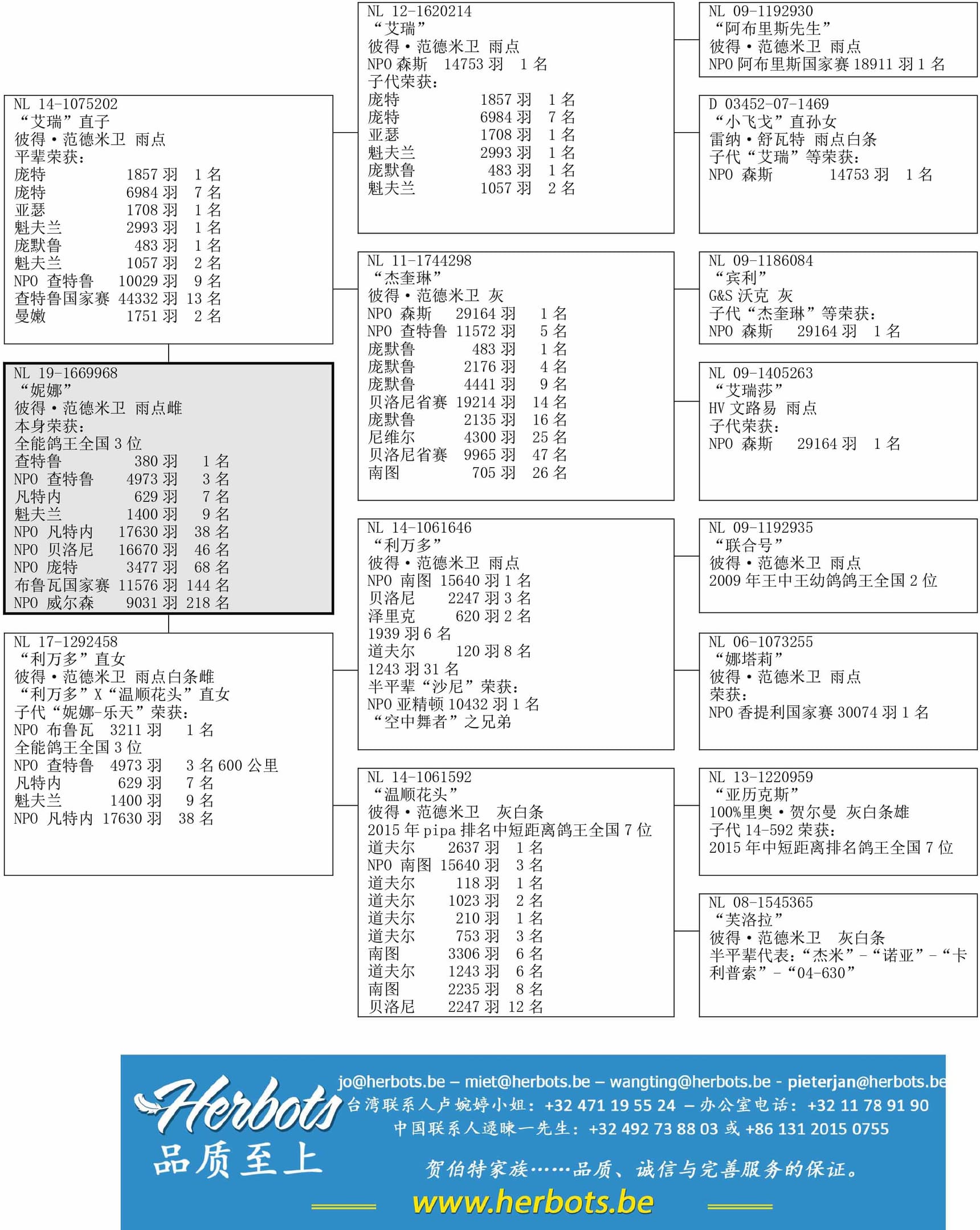 “利万多”( NPO 南图 15,640羽1名 – 贝洛尼 2,247羽3名) x “温顺花头雌” (2015年鸽王全国7位) 直女