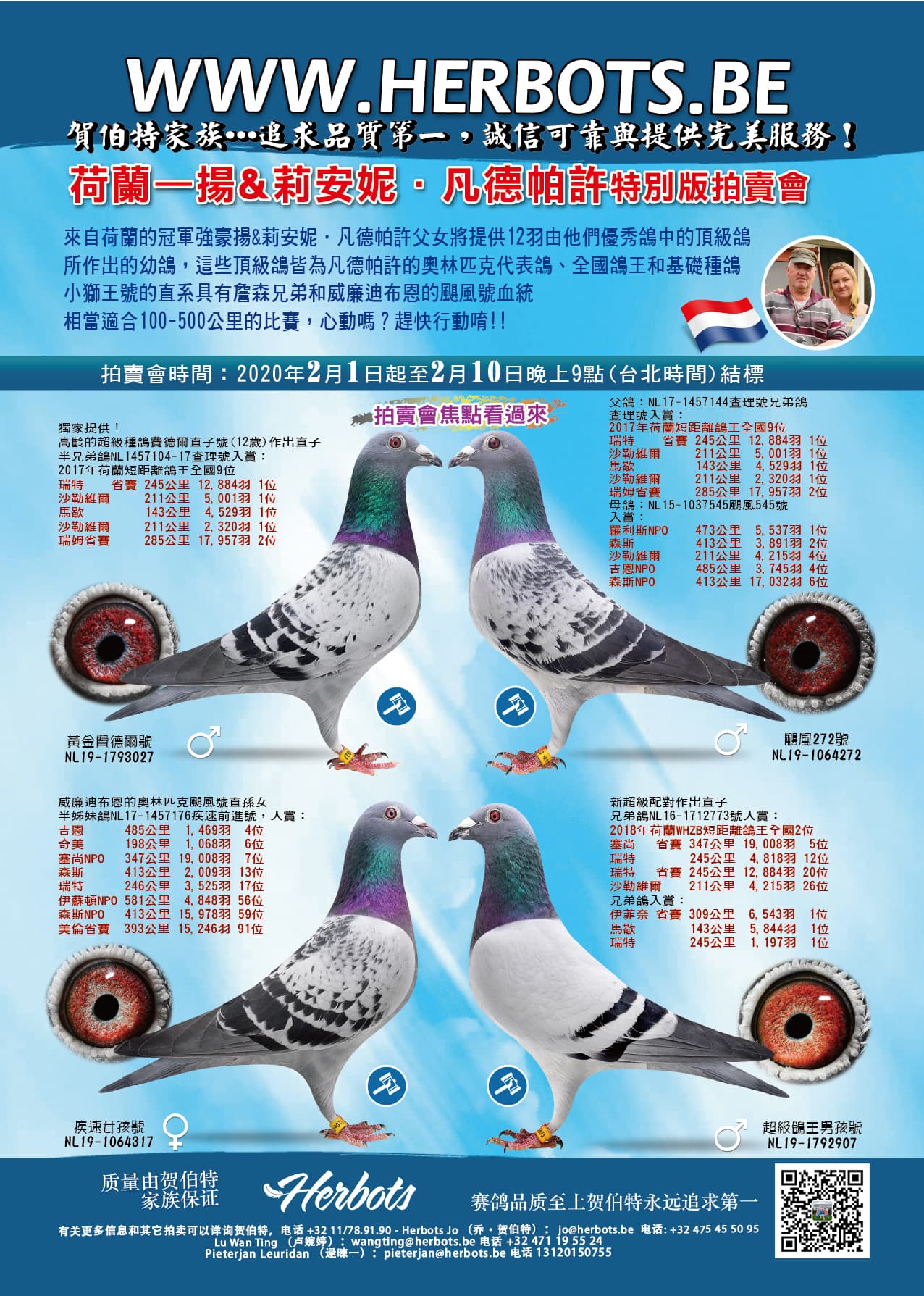 来自赫吕本福斯特的杨&范德帕许父女鸽舍(荷兰)在本次特别版拍卖会中为您提供他们鸽舍最棒的12羽幼鸽。所有这些顶级鸽都与奥林匹克代表鸽、国家赛鸽王、基础种鸽“小路易”(詹森·阿连栋克原舍鸽)及“飓风”(威廉.迪布鲁恩原舍鸽)有关;那些想要触击100公里到500公里的人必须在本次拍卖中抓住机会,因为这是一个赢家家庭!