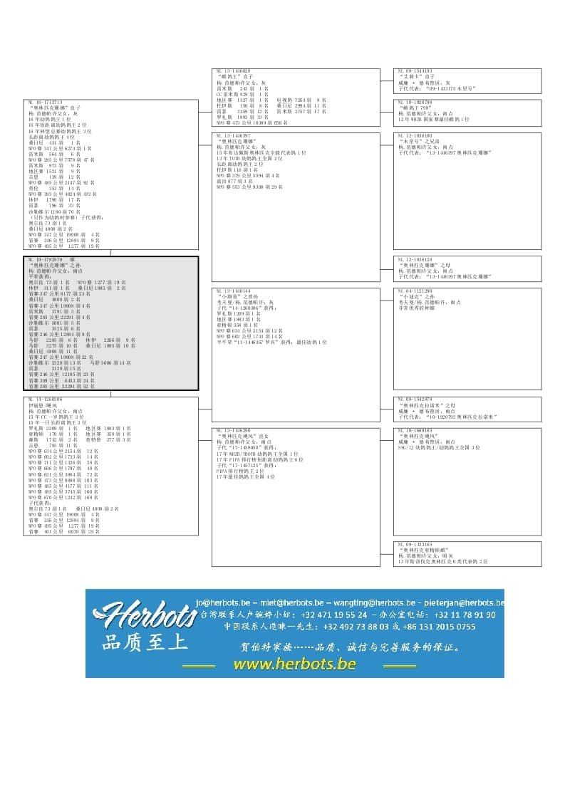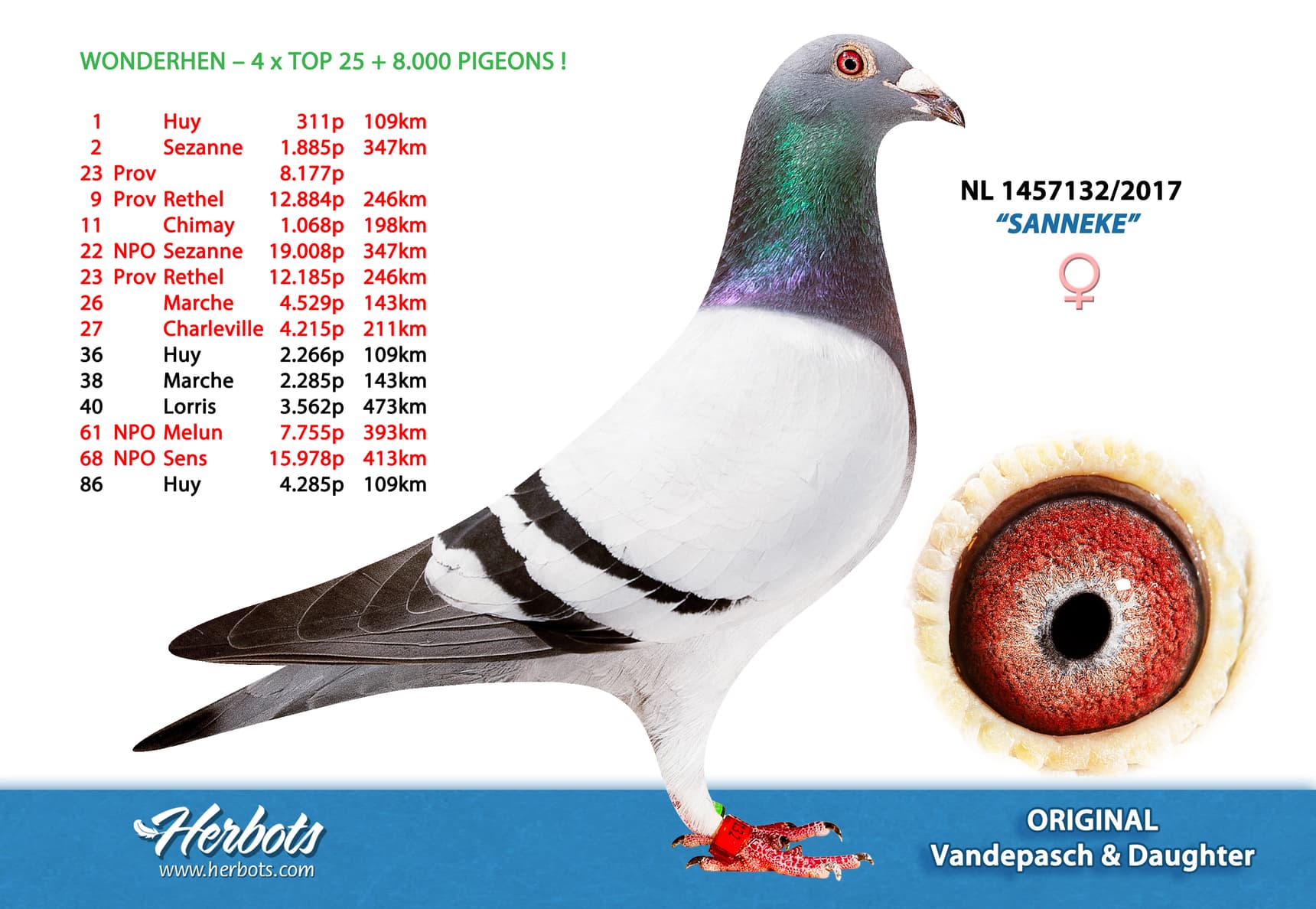 全平辈4羽顶级雌鸽获得:雷米斯省赛 285公里 22291羽 4名NPO桑日尼 347 公里 19008羽 4 名雷瑟省赛 245公里 12884羽 9名NPO桑日尼 347 公里 19008羽 22名雷瑟省赛 245公里 12185羽 23名桑日尼省赛 247公里 8177羽 23名NPO莫伦 401 公里 6039羽 25名