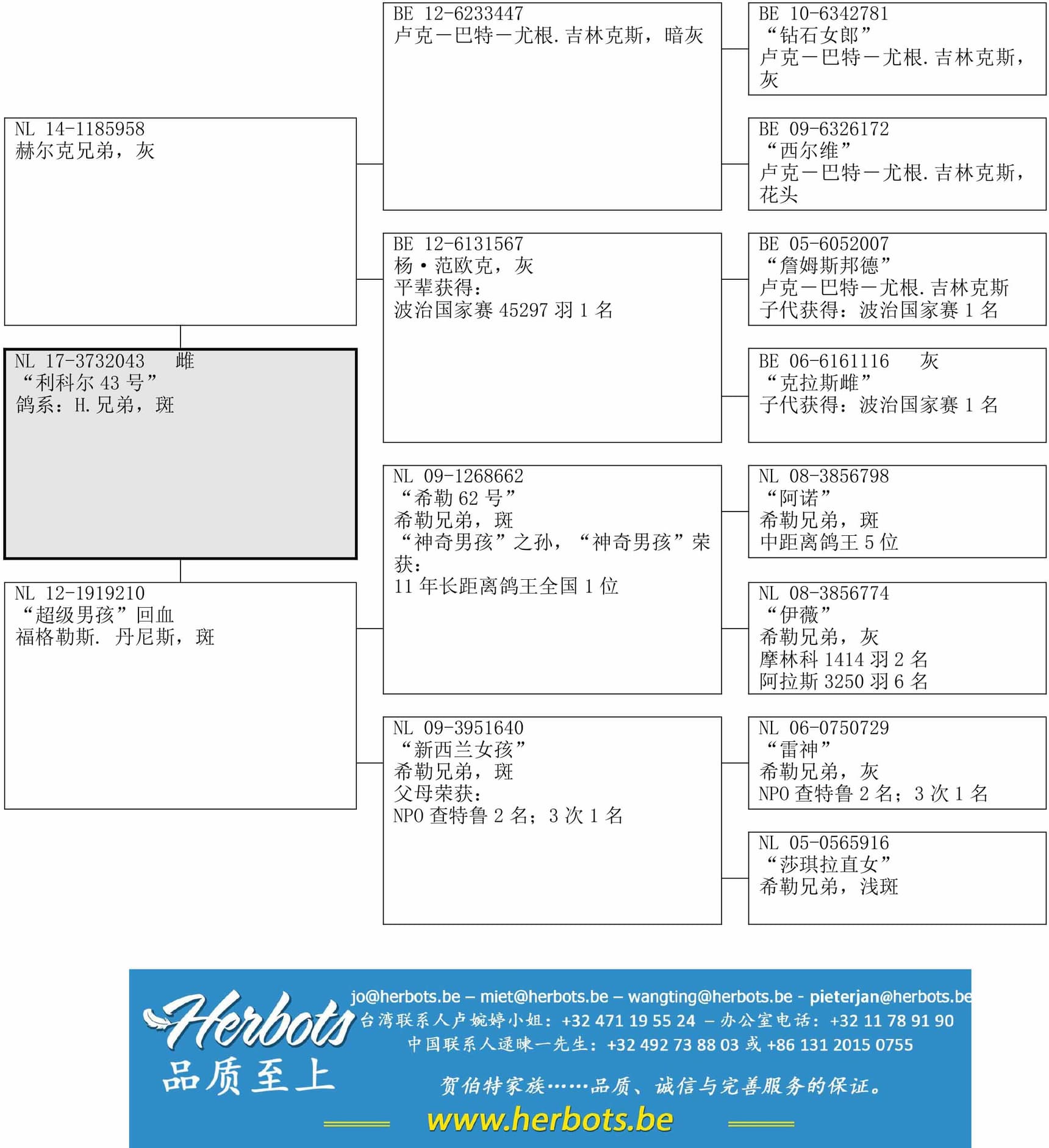 子代代表及佳绩:“未来男孩之兄弟”:只作为幼鸽时参赛荣获;比耶日1335羽11名 摩林科651羽18名 蓬城圣马克斯712羽20名